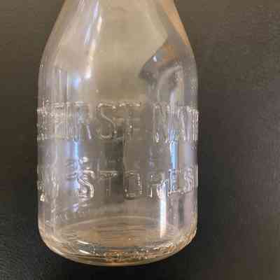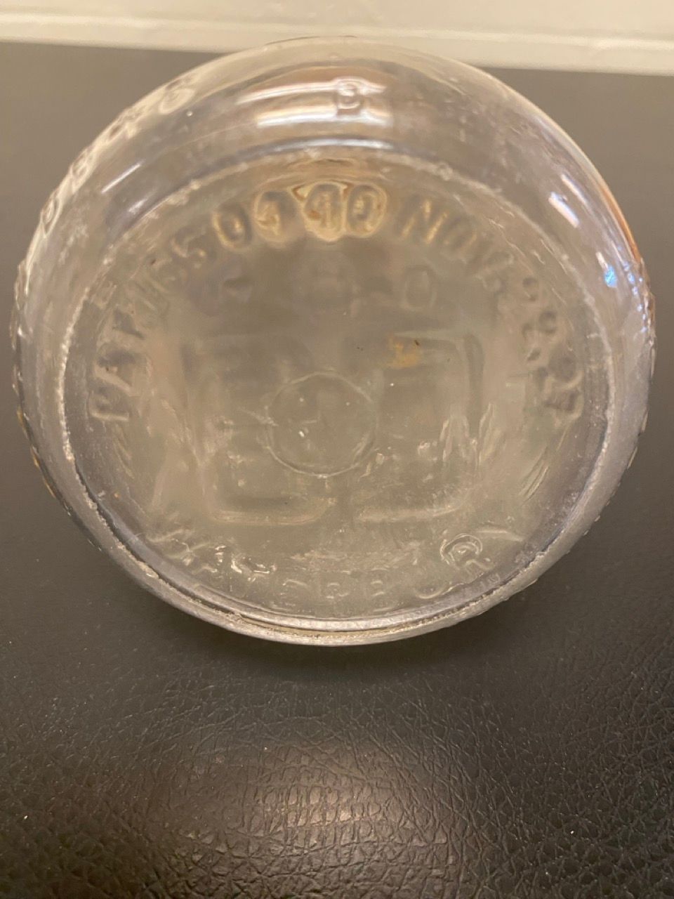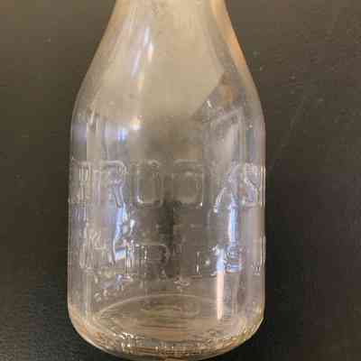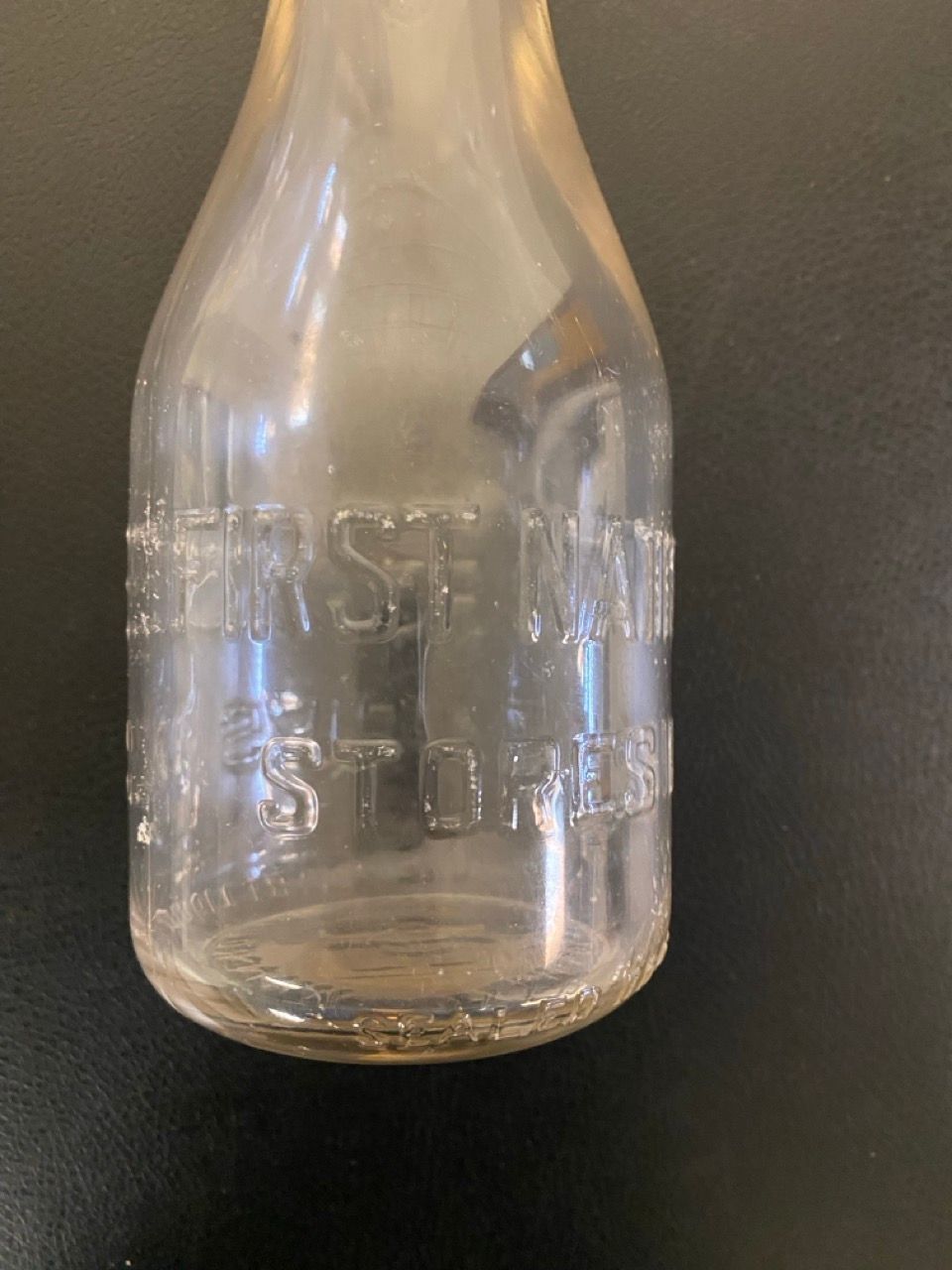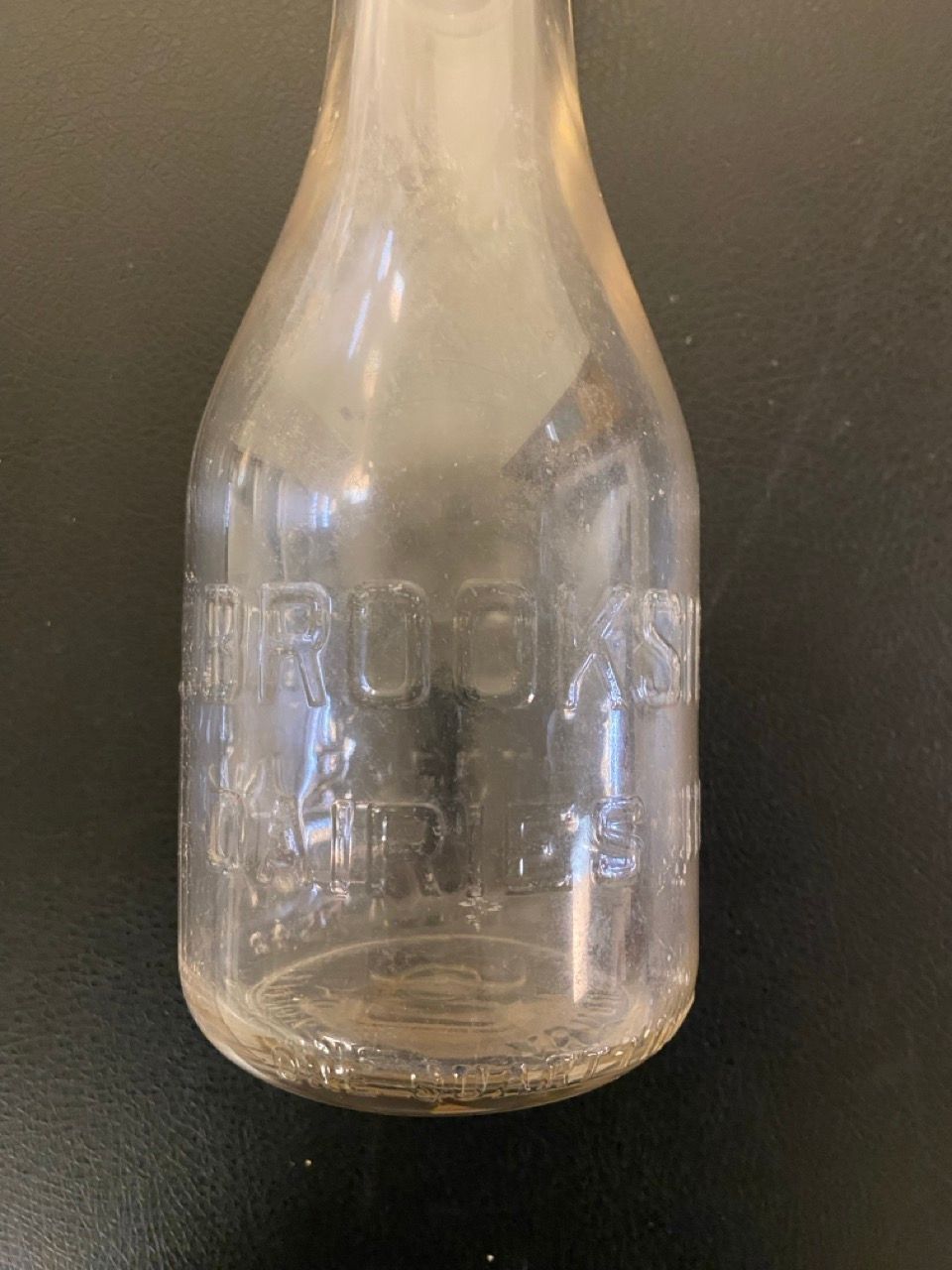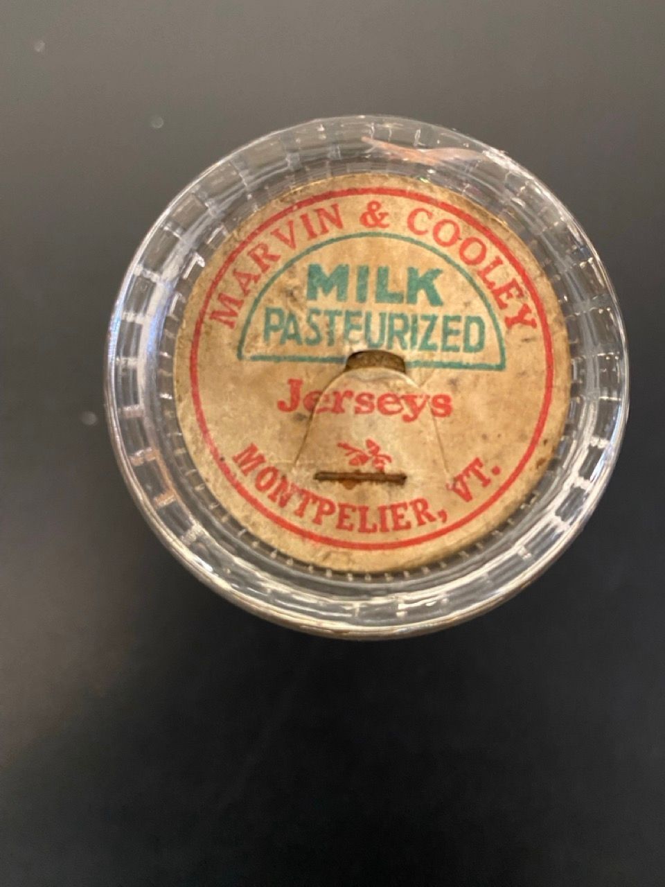 Clear glass milk bottle with Marvin & Cooley flat paper bottle top. Bottle top reads "Marvin & Cooley / Milk / Pasteurized / Jerseys / Montpelier, Vt." Bottle reads "Brookside / Dairies Inc. / One Quart Liquid" and "First National / Stores Inc. / Sealed BB48." Bottom of bottle reads "BD / Waterbury."