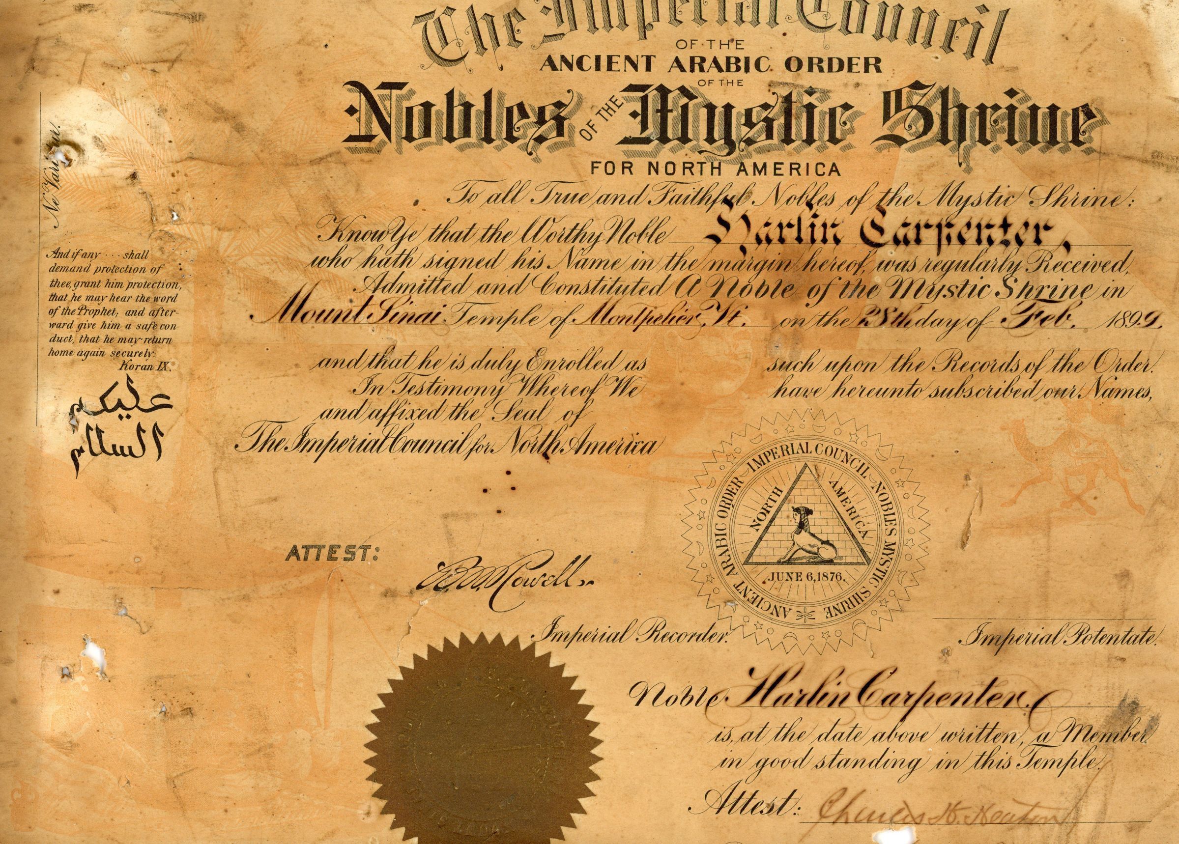 Ancient Arabic Order of the Nobles of the Mystic Shrine for North America. Mount Sinai Temple (Montpelier, Vt.), Carpenter, Harlin, 1841-1910, Heaton, Charles H., 1844-1933