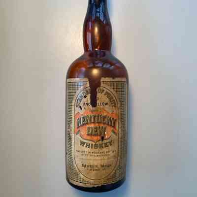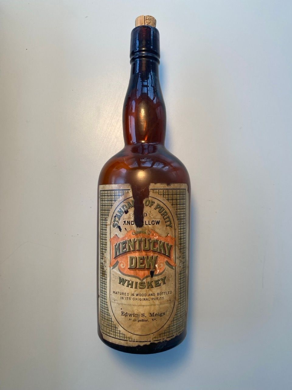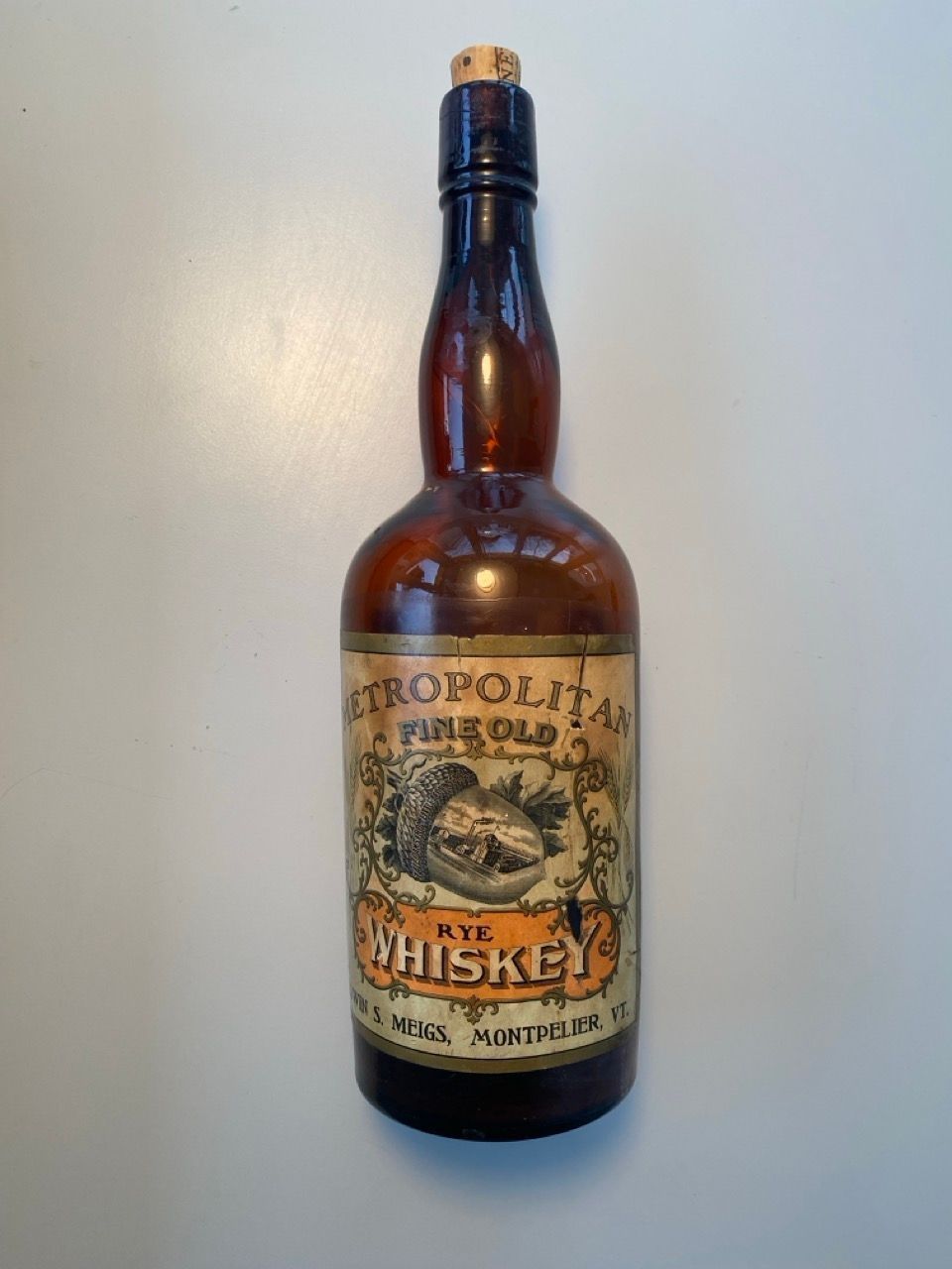 Brown glass whiskey bottle with two paper labels and modern cork. Front label reads "Metropolitan / Fine Old / Rye / Whiskey / Edwin S. Meigs, Montpelier, Vt." Back label (damaged) reads "Standard of Purity / [illegible] / And [Me]llow / Kentucky / Dew / Whiskey ... Edwin S. Meigs / Montpelier, Vt." It is not clear if both of these labels appeared on the same bottle or if a collector has affixed two labels from different products to one bottle.Context