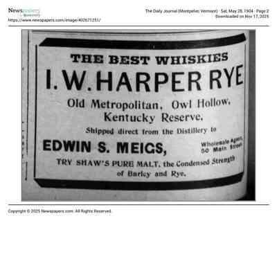 Edwin S. Meigs ran a saloon at 50 Main Street, Montpelier, Vt., beginning in 1903. According to Google's AI Overview, "'Kentucky Dew' refers to a vintage bourbon whiskey brand bottled by the Kentucky Dew Distilling Company in Louisville, Kentucky, likely between 1934 and 1949." And "The label for Metropolitan Fine Old Rye Whiskey is a vintage item, likely from the mid-20th century, which often appears on bottles with enameled or printed glass designs"Lexicon
