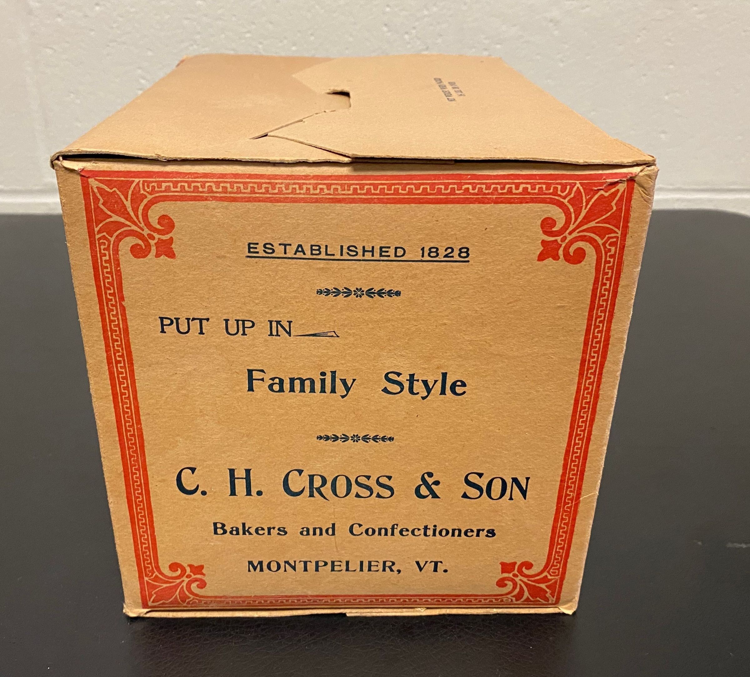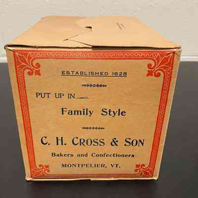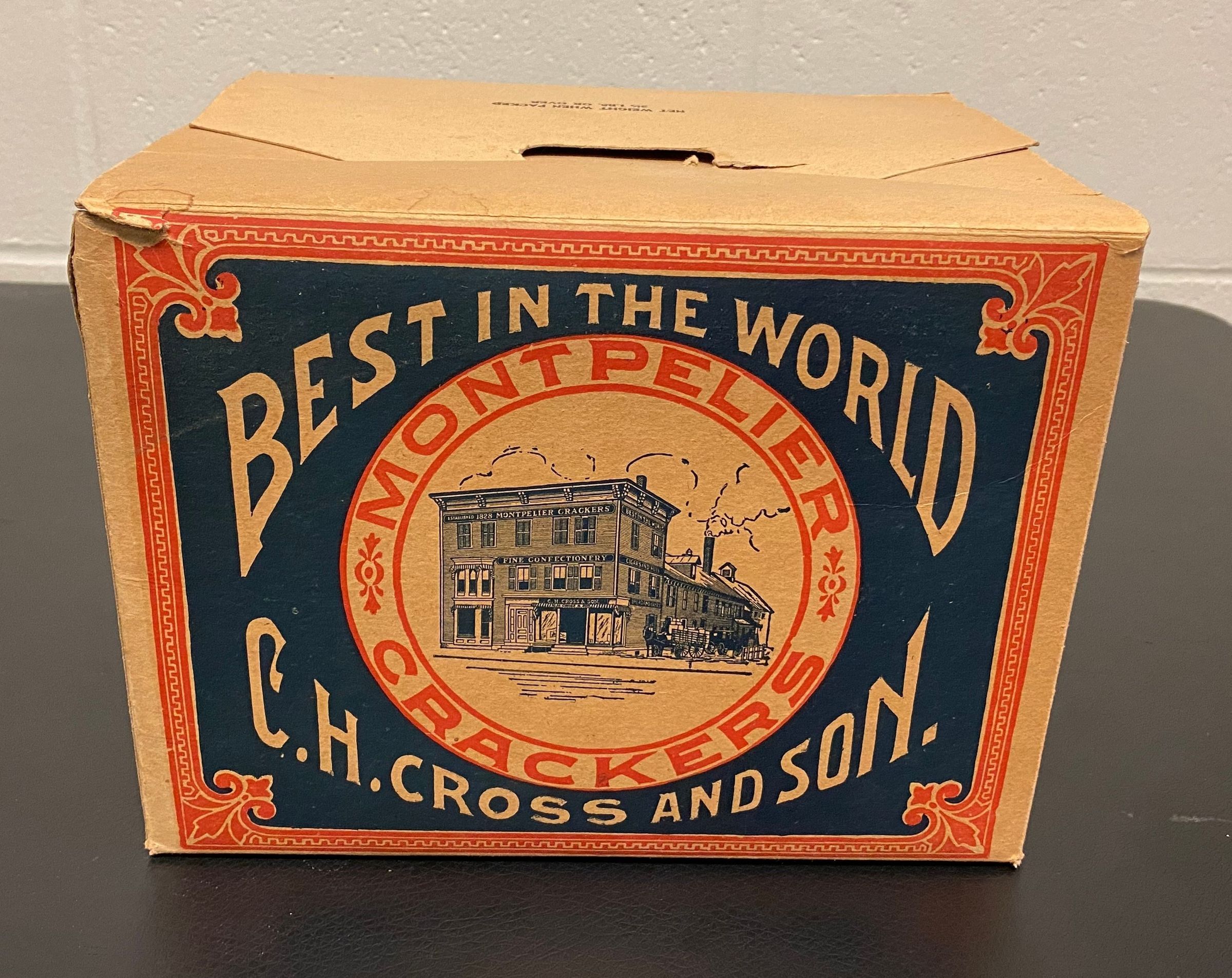 Cardboard box used to package a type of "common cracker" manufactured in Montpelier, Vermont, by C.H. Cross and Son, known as Montpelier Crackers. Image of the companies store and bakery on Main Street in Montpelier is shown on the box.