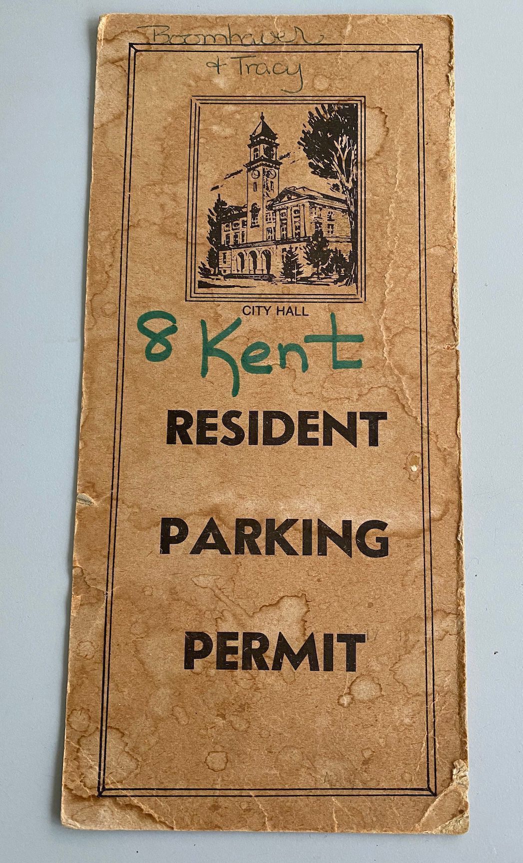 Paper "Resident Parking Permit" for 8 Kent Street issued to Daniel H. Boomhower and Roberta S. Tracy, 1993.Context