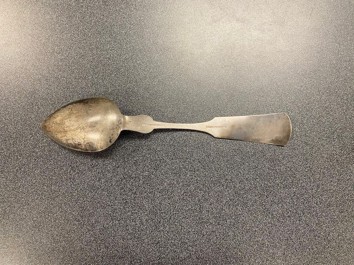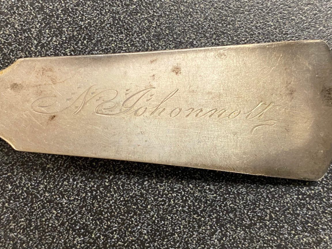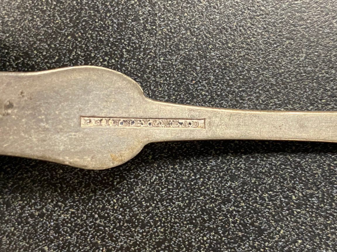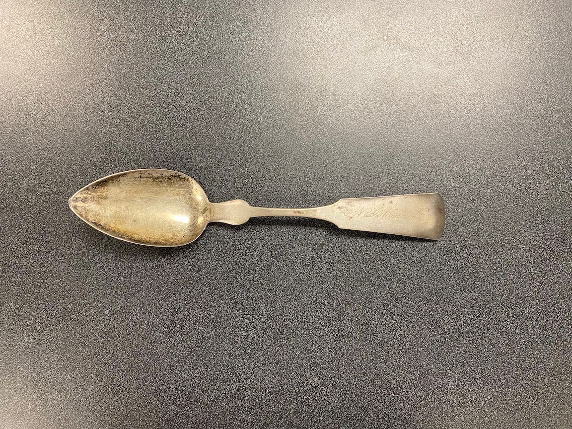 Silver plate spoon made by Phinney & Mead of Montpelier, Vermont. Engraved "N Johonnott."Context