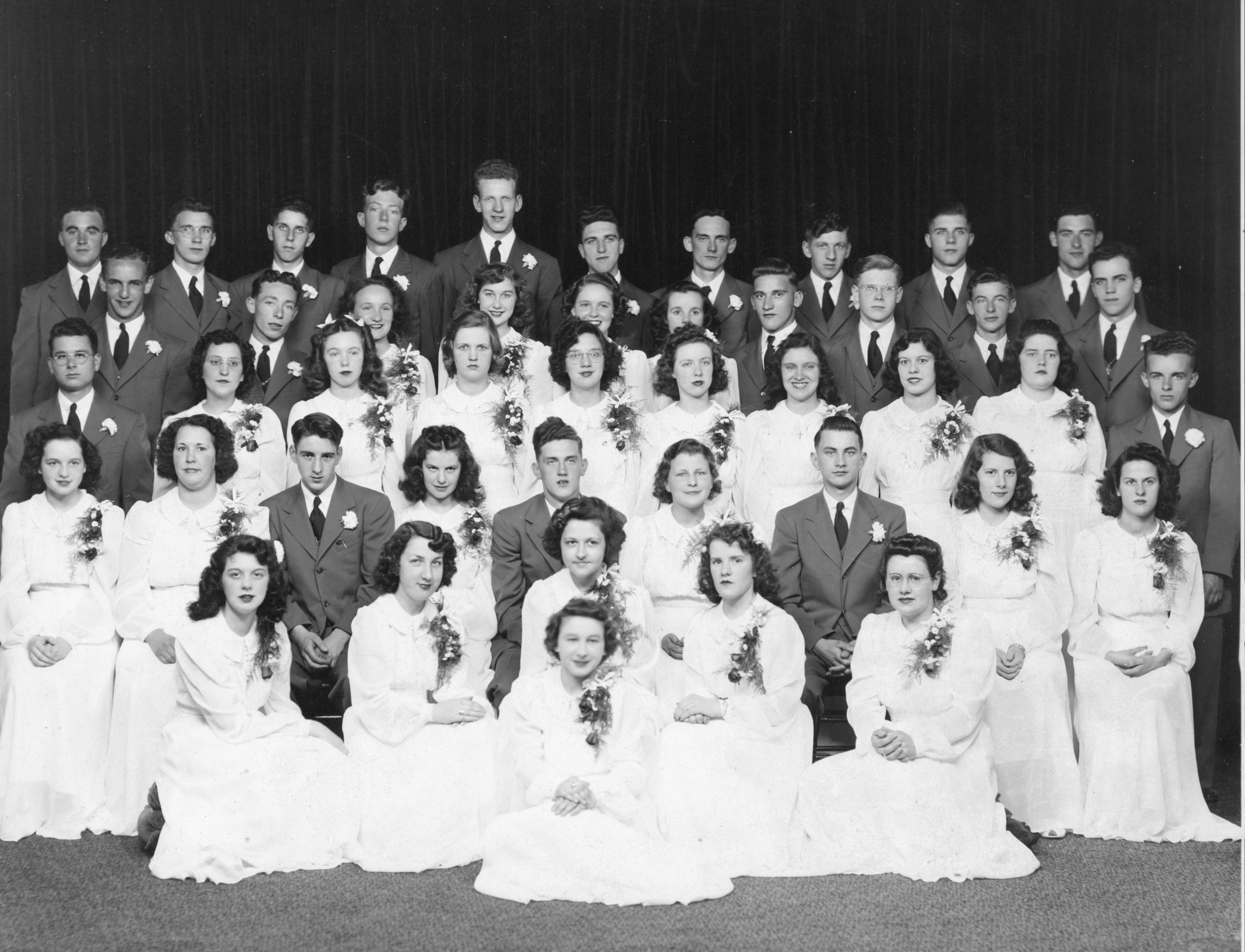 Members of the St. Michael's High School Class of 1942 pose for a formal photograph in suits and white dresses.Photograph Details