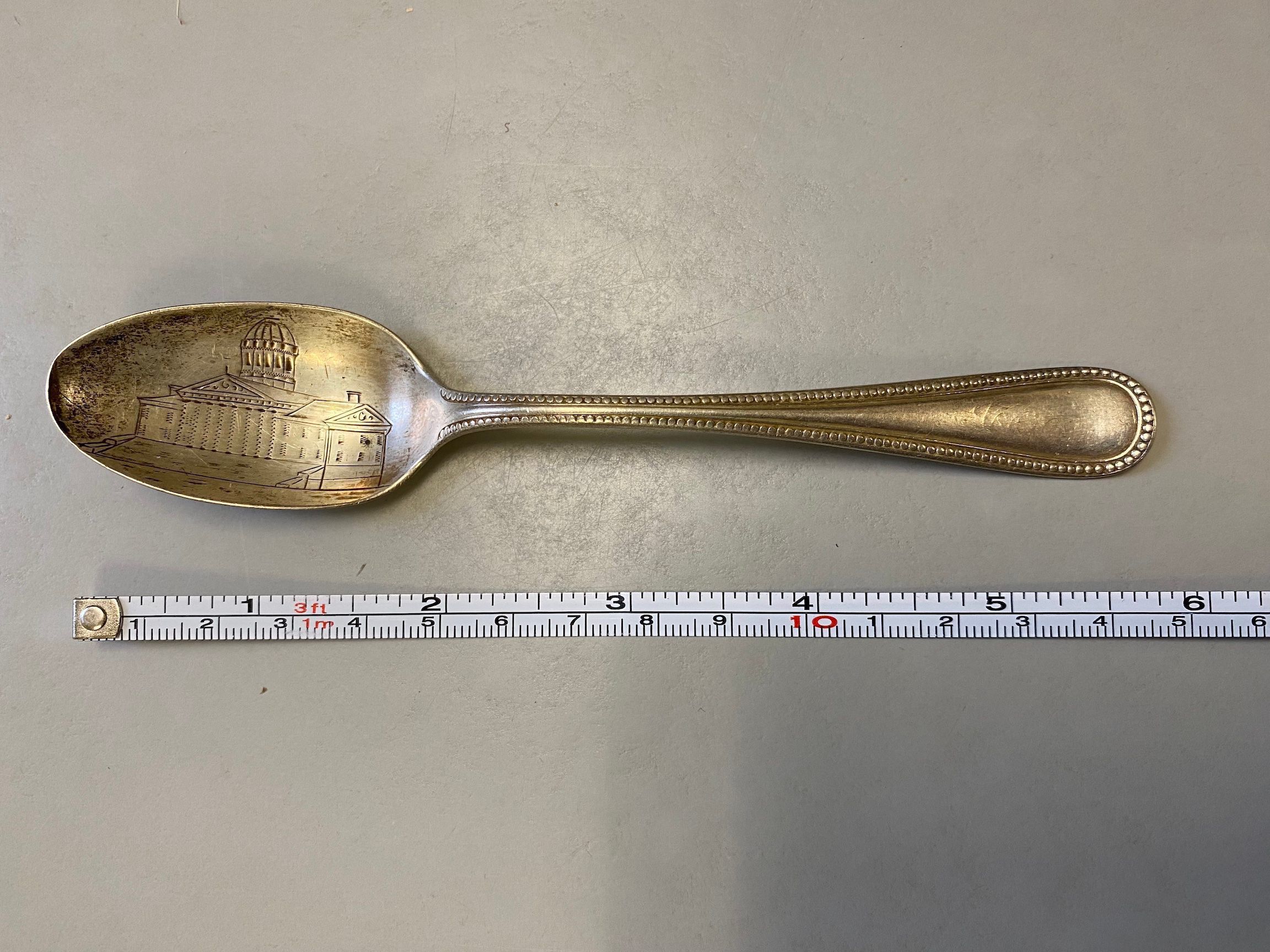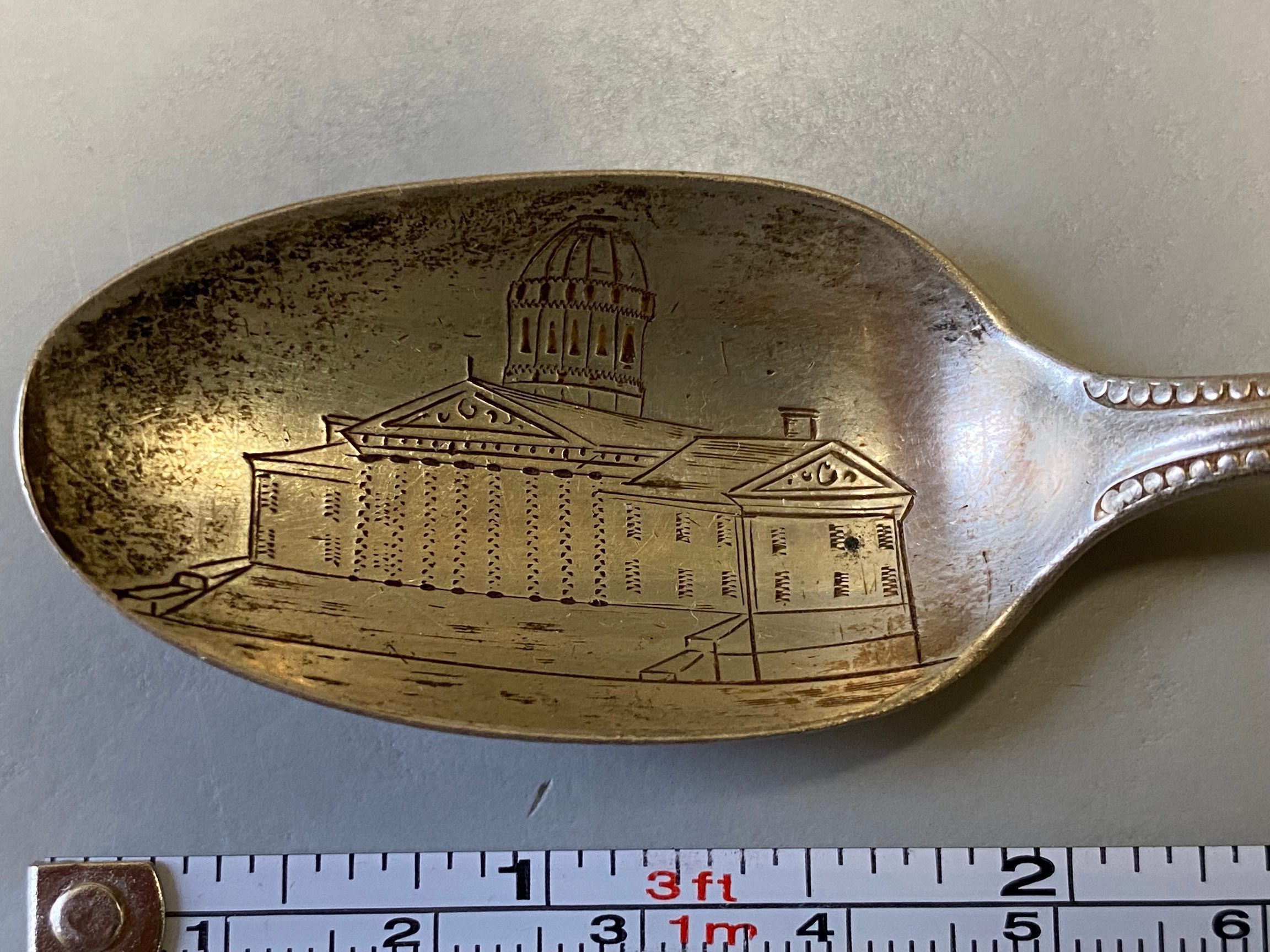Silver souvenir spoon with lightly engraved image of the third Vermont State House (1859) on the bowl and simple design along edges of handle. Stamped "sterling" on the back of the handle. "Cora" (?) scratched on front of handle; "Christmas" (?) scratched on back of handle.Context