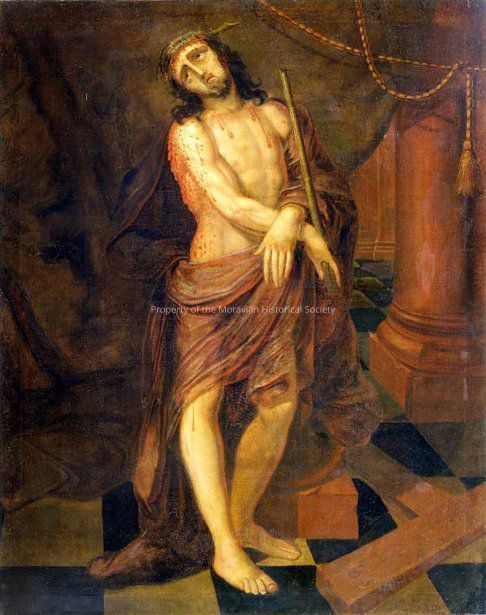 This is one of six paintings Haidt made dealing with the death and resurrection of Christ, for the Saal in the Manor House in Nazareth. MHS has all six in the collection, "Christ in Gethsemane", "Adoration of the Shepherds", "The Crucifixion", "Lamentation over the Body of Christ", and "Thomas Doubting".Acquisition