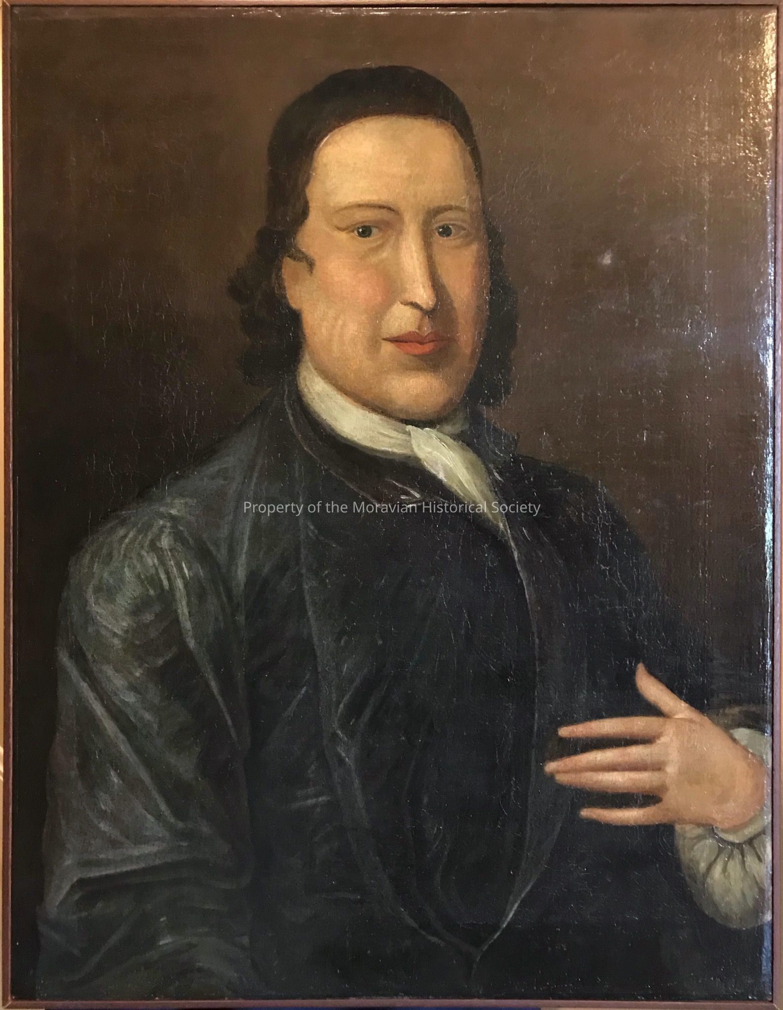 Zinzendorf is depicted in a blue coat, white neck tie, and black head covering. His hand is raised, fingers extended to this breast.Acquisition
