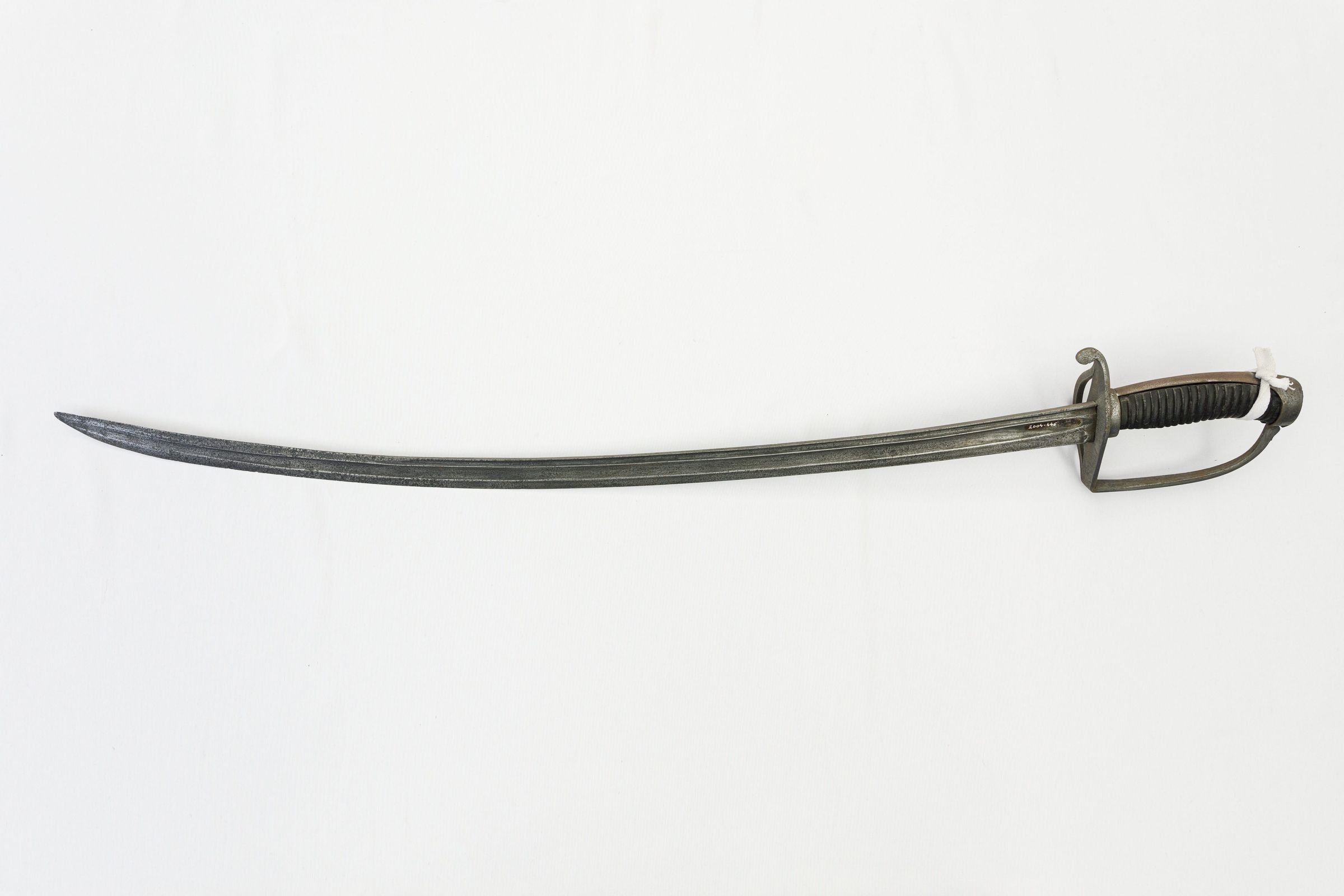 Un sabre de cavalerie américain avec une lame à simple tranchant. Sa lame longue et légèrement incurvée est coupée sur chaque face avec une gouttière sur toute sa longueur et une gouttière courte et fine le long du bord arrière. La poignée est en bakélite et est renforcée par une carcasse en acier à l'intérieur et à l'extérieur. Il est doté d'un arc de jointure en forme de bande métallique étroite qui se courbe sur la longueur du poignet. Le poignée en bakélite est cassée et il en manque un morceau à l'arrière. Un ruban en tissu blanc permet de maintenir en place la poignée en bakélite cassée.