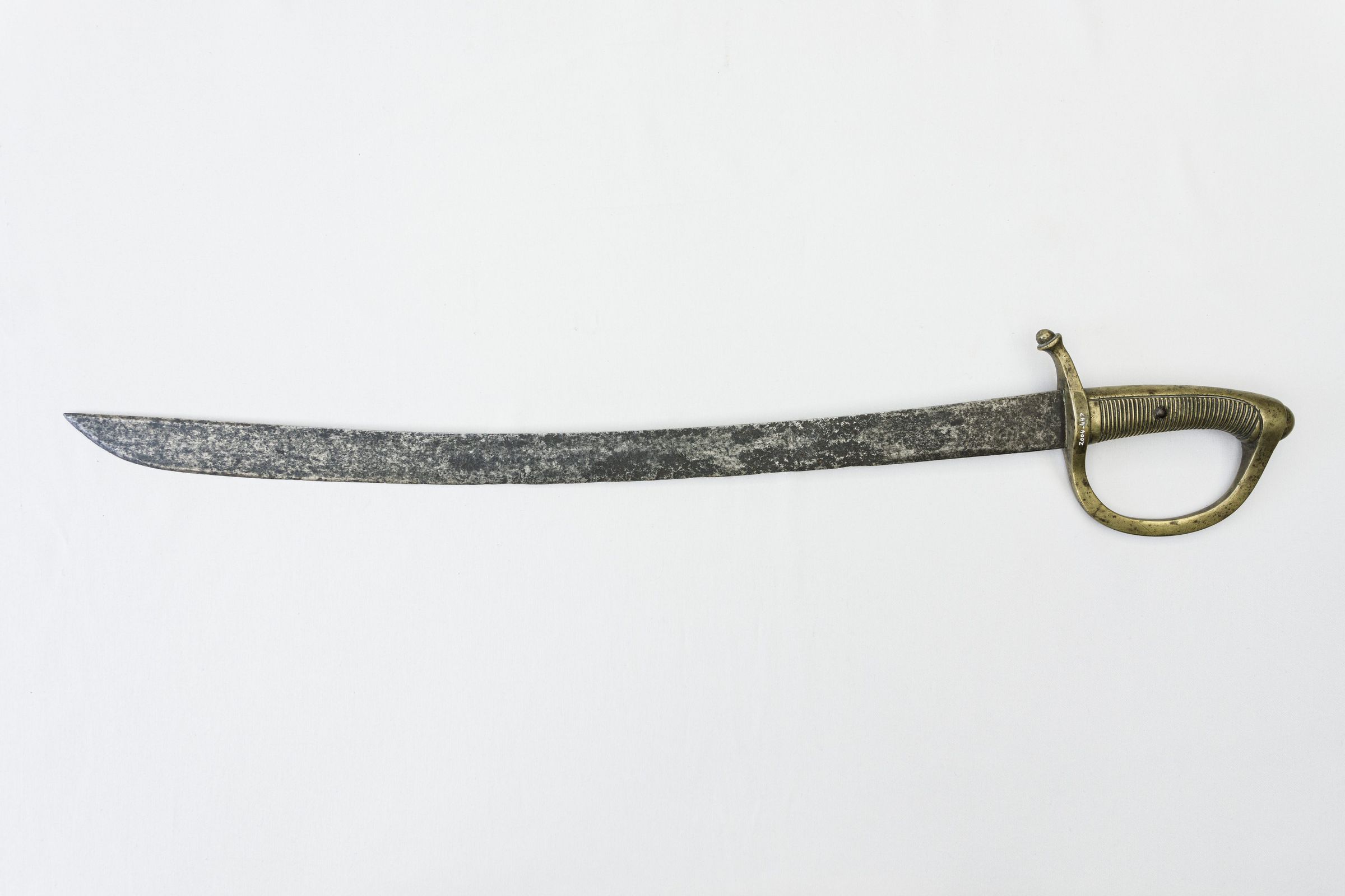 A hanger sword with a slightly curved single-edged steel blade. It has an S-shaped crossguard that merges into the knuckle guard. The grip is made of brass and has a striped design on both sides. Une épée de chasse avec une lame en acier à simple tranchant légèrement incurvée. Elle possède une garde en forme de S qui se transforme en en arc de jointure. La poignée est en laiton et présente un motif rayé sur les deux côtés.