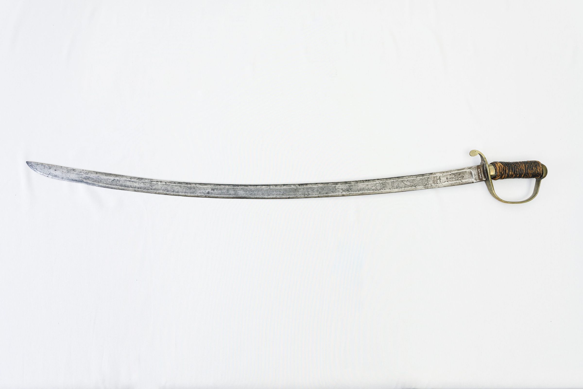 A single-edged parade sabre. It has a long, slightly curved blade, cut on each face with a full-length fuller and a short slender fuller along the back edge. The handle is covered with a varnished [?] coarse fibre rope. The crossguard is S-shaped and transforms into a knuckle guard. Identical decorative engravings are found on both sides of the blade. In the centre of the blade, there is an engraved image of the hussar on horseback and brandishing a sabre. The words "Vivat Hüssar" appear above the hussar, while floral motifs appear above the inscription and below the hussar. An engraved composition of a column, drum and two crossed arrows is visible between the hussar and the handle. There is a piece of black leather lined between the steel blade and the brass hilt.