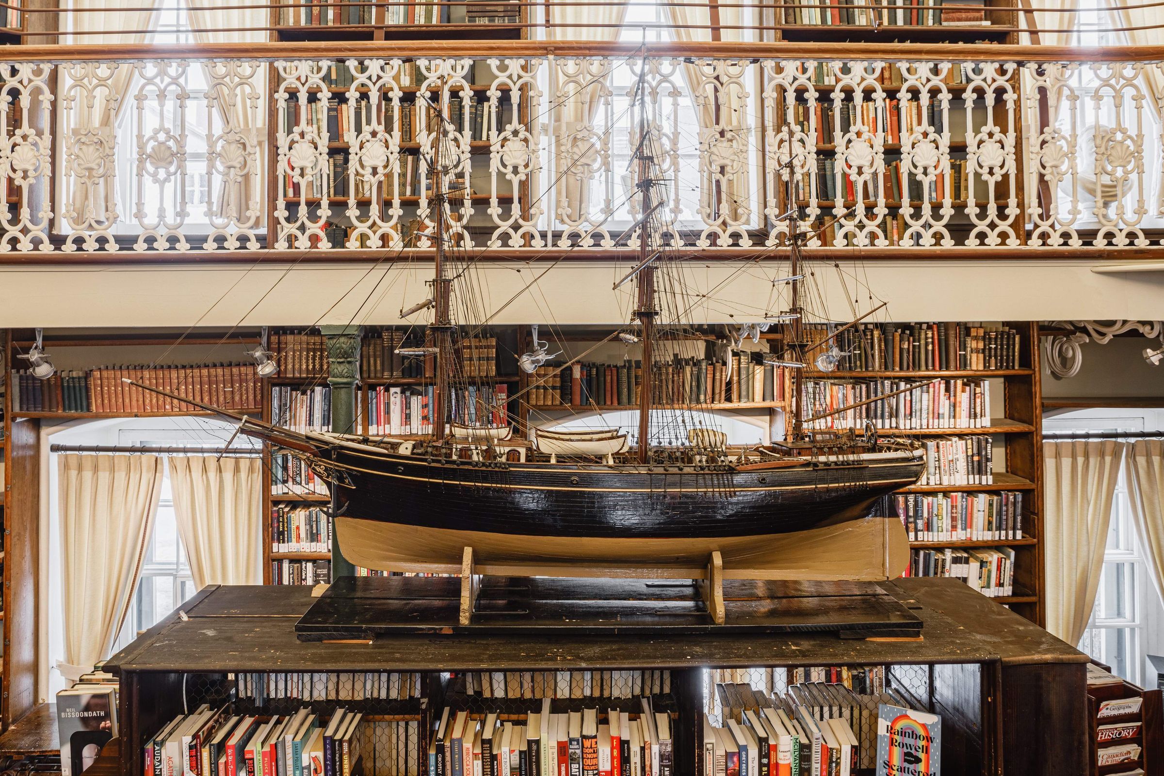 La maquette du voilier « Cosmo », un trois-mâts marchand construit en 1877. La moitié inférieure de la coque est peinte en beige, tandis que la moitié supérieure est peinte en brun foncé. Elle est surmontée de deux moulures dorées. La proue est décorée de motifs végétaux dorés et d'une flèche sur le devant. La poupe est décorée d'une corde dorée et de détails végétaux. Les mots "Cosmo Que." sont inscrits en lettres blanches, entre deux paires de drapeaux (un drapeau français croisé avec un drapeau montrant ce qui est probablement une croix de St-Andrew (ou un drapeau écossais). L'inscription et les drapeaux se trouvent sur une fine plaque de bois fixée au navire par des clous. Deux ancres se trouvent de chaque côté de l'avant du navire. La partie supérieure de la coque, entre les moulures dorées, est peinte en noir. Trois trou circulaires (« potholes ») se trouvent de chaque côté de cette partie, ainsi que deux cabines de marins peintes en blanc sur le pont. Deux canots de sauvetage blancs reposent sur le toit de la cabine avant ; deux tonneaux blancs se trouvent également sur le toit de la cabine avant ; et deux tonneaux blancs se trouvent sur le toit de l'autre cabine. Entre les deux cabines, deux grandes embarcations de sauvetage blanches reposent sur deux arcs de soutien blancs. La cabine du capitaine, située sur le pont arrière, est peinte en brun. Tous les éléments de la maquette sont fonctionnels.Made/Created