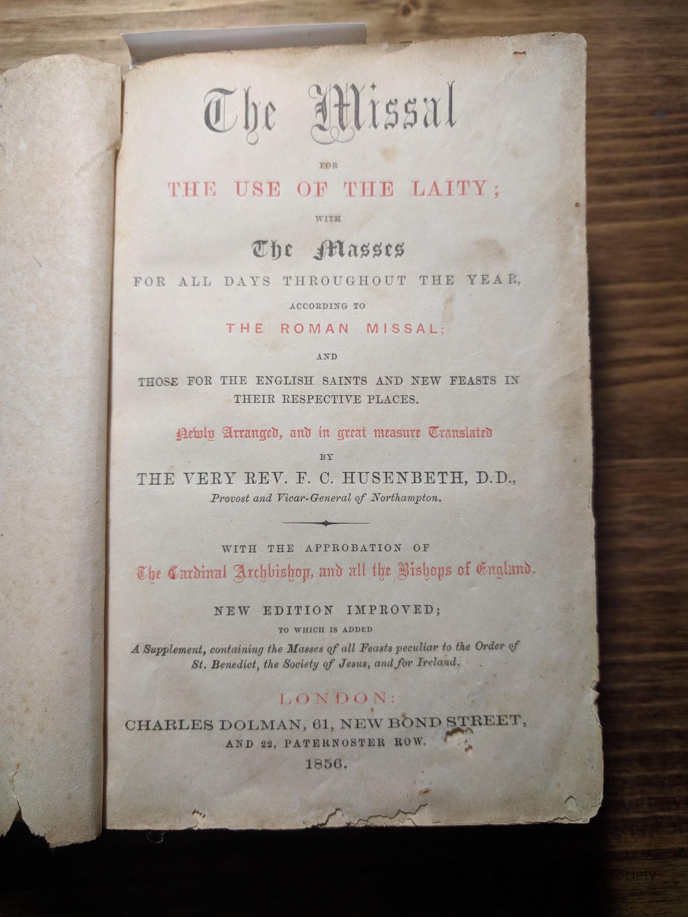 The Missal for the use of the Lity by Rev. FC Husenbeth To William P Mountain - 5/31/1866 - James L Dunn