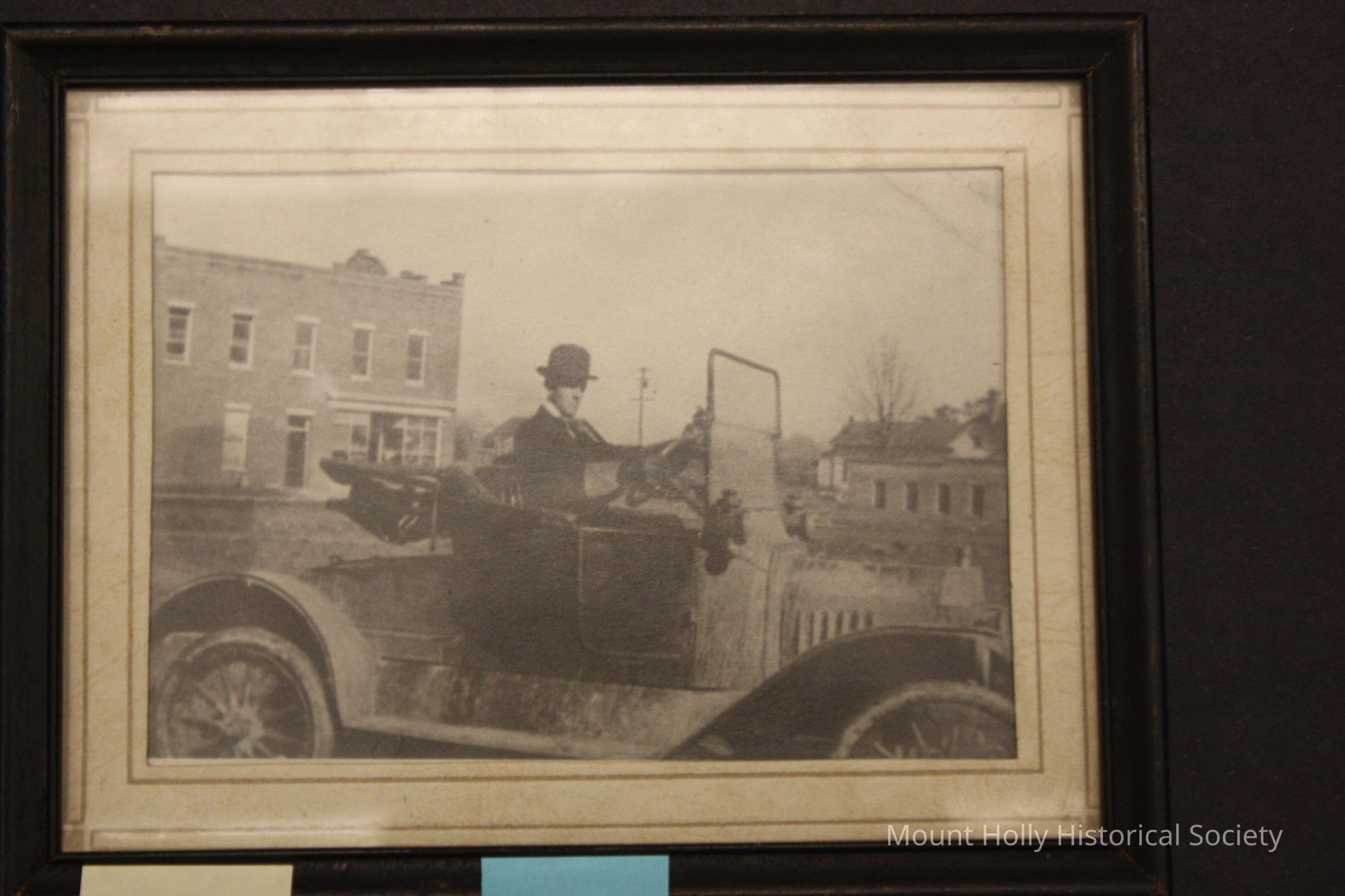 Photo of Dr. Moore sitting in 1916 Ford, corner of South Main and Central, Mt. Holly, NC Donated by Mrs. B. D. Moore