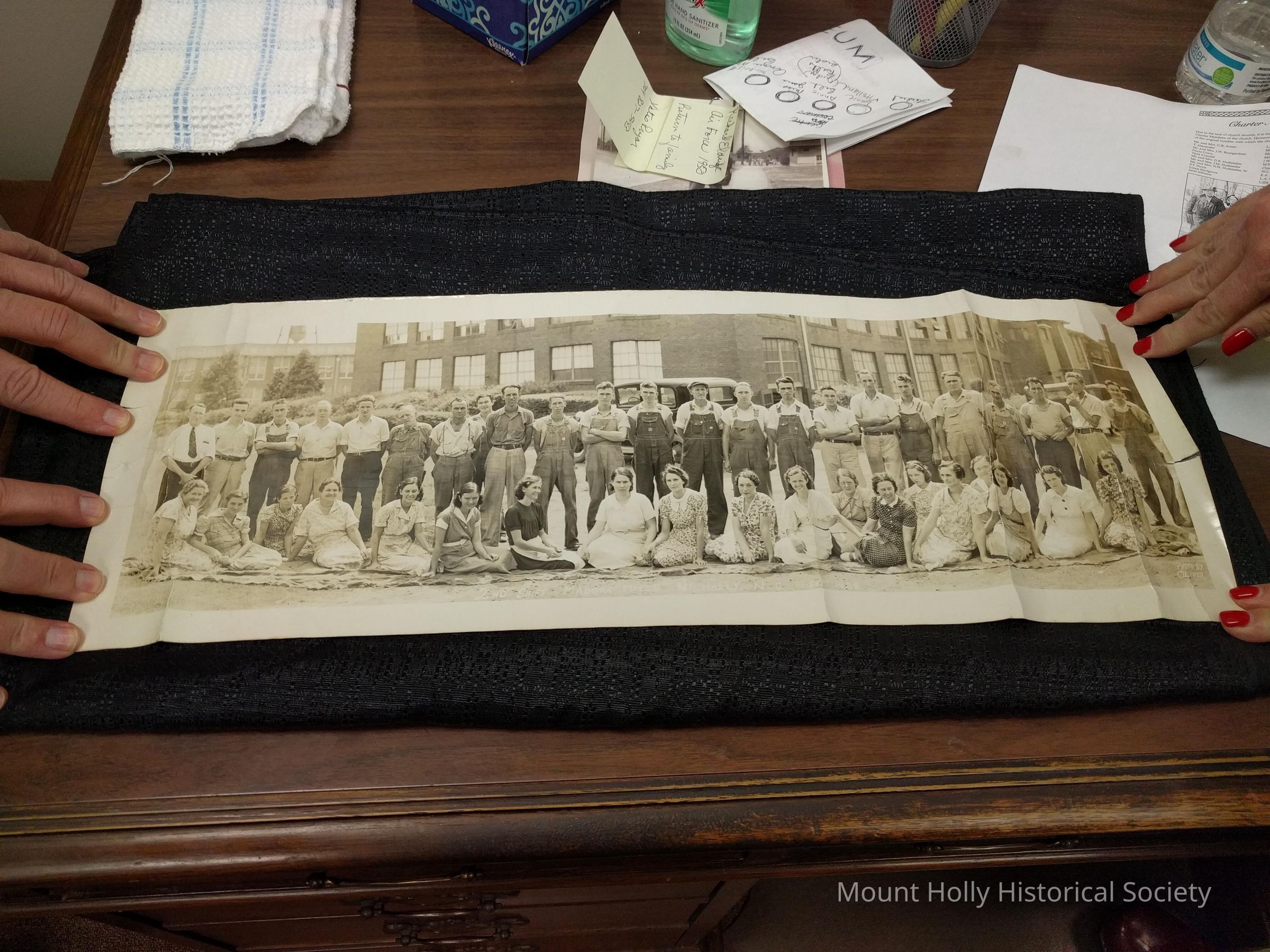 Men and women in front of mill Possibly American-Efrid Adrian (Madora) Mill Back row 4th from left: Walt Helena Bottom row 13th from left: Pauline Helms 32 Model Ford