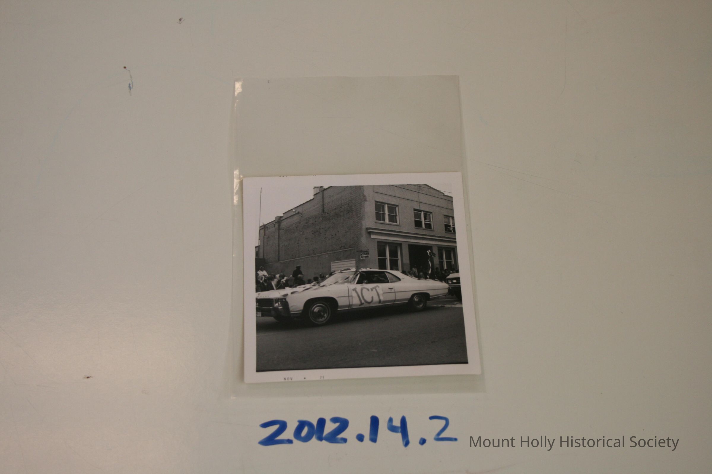 Car with "ICT" on side near "police" sign, probably parade, old municpal building Developed 10/1971