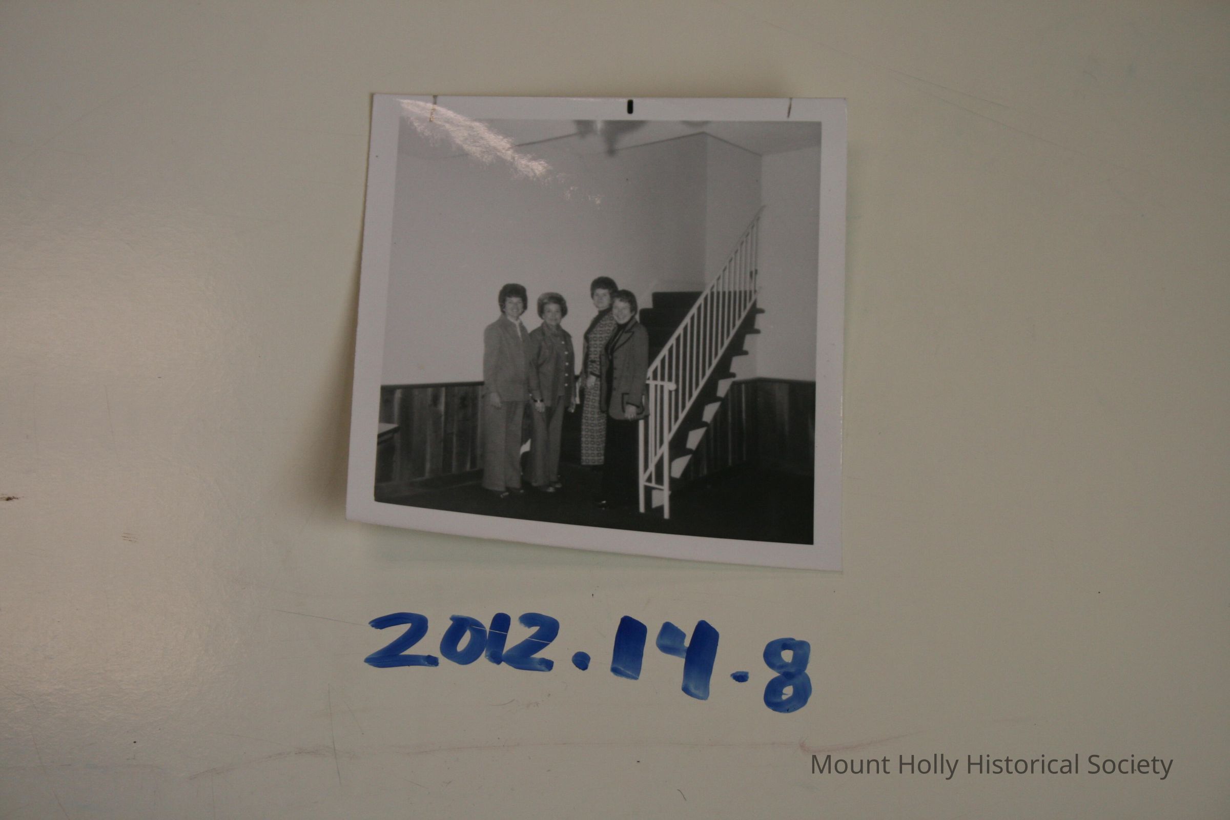 "Fashion show models, mount holly" - 4 women standing beside a staircase