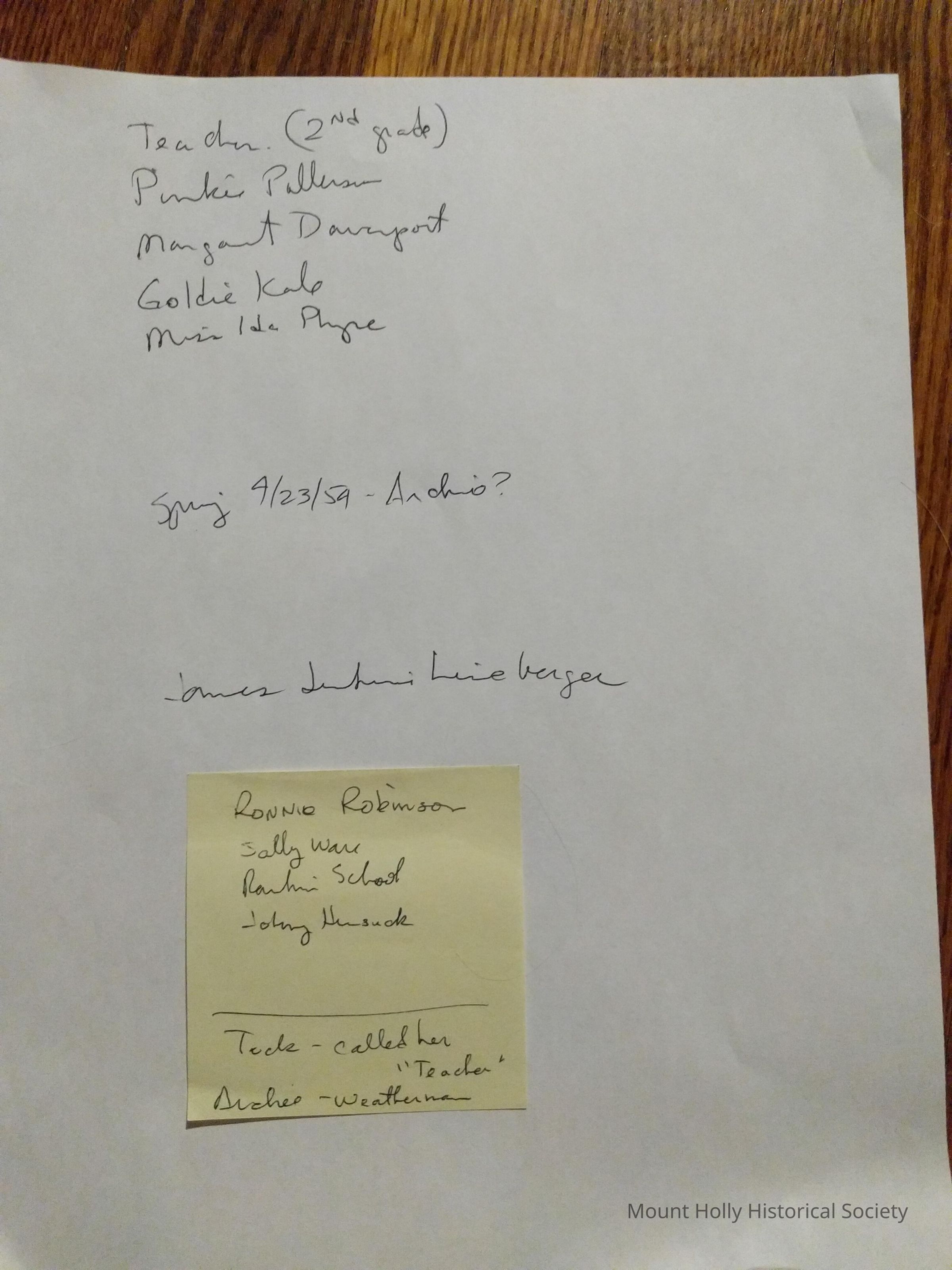 Teacher (2nd grade), Pinkie Patterson, Margaret Davenport, Goldie Kale, Matilda Payne, James (?) Lineberger, Ronnie Robinson, Sally Ware, Rankin School, Johnny Hunsuck (?), Archie Weatherman, Spring 4/23/59?