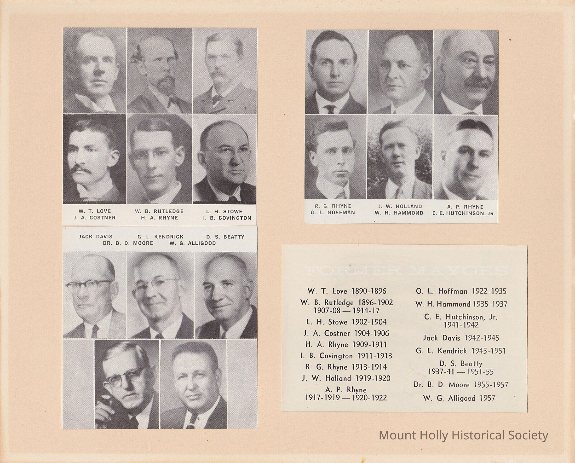 Former Mayors: W T Love (1890-1896), W B Rutledge (1896-1902, 1907-1908, 1914-1917), L H Stowe (1902-1904), J A Costner (1904-1906), H A Rhyne (1909-1911), I B Covington (1911-1913), R G Rhyne (1913-1914), J W Holland (1919-1920), A P Rhyne (1917-1919, 1