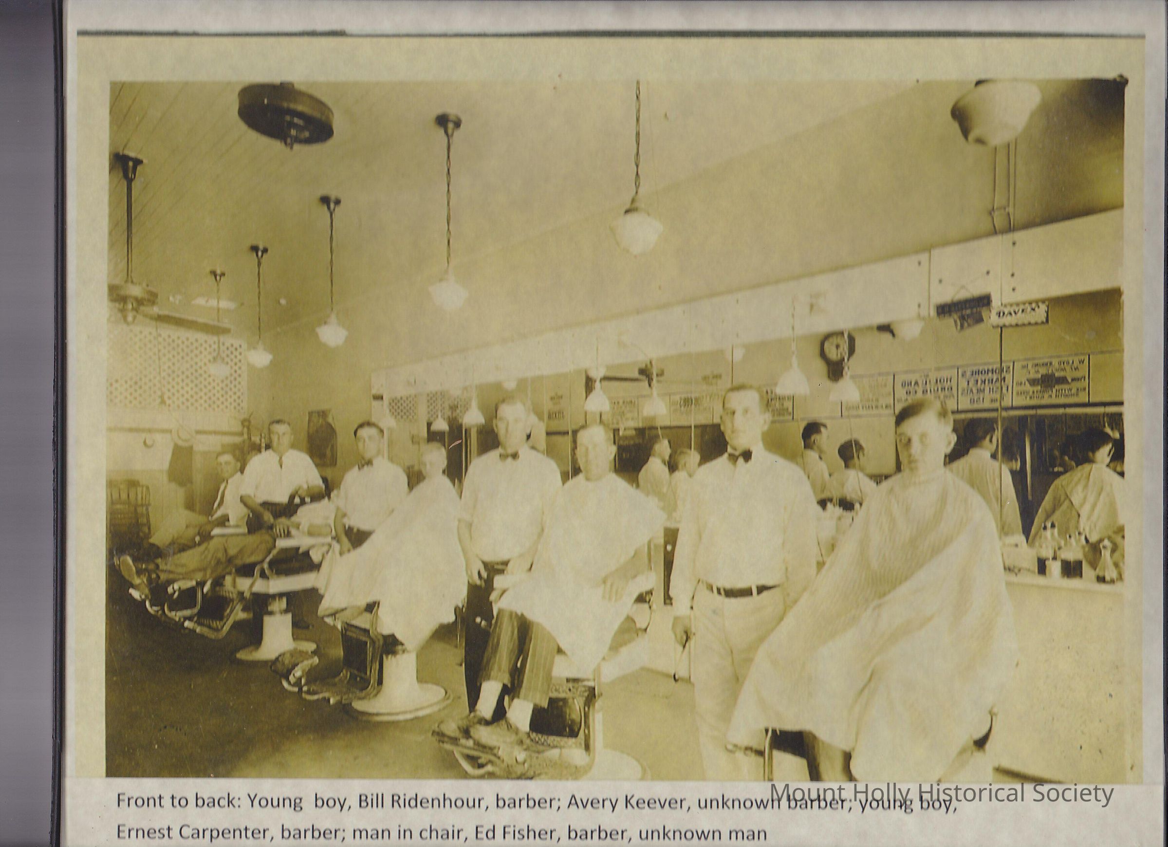 Front to Back: Young boy, Bill Ridenhour, barber, Avery Keever, Unknown barber, young boy, Ernest Carpenter, barber, man in chair, Ed Fisher, barber, unknown man