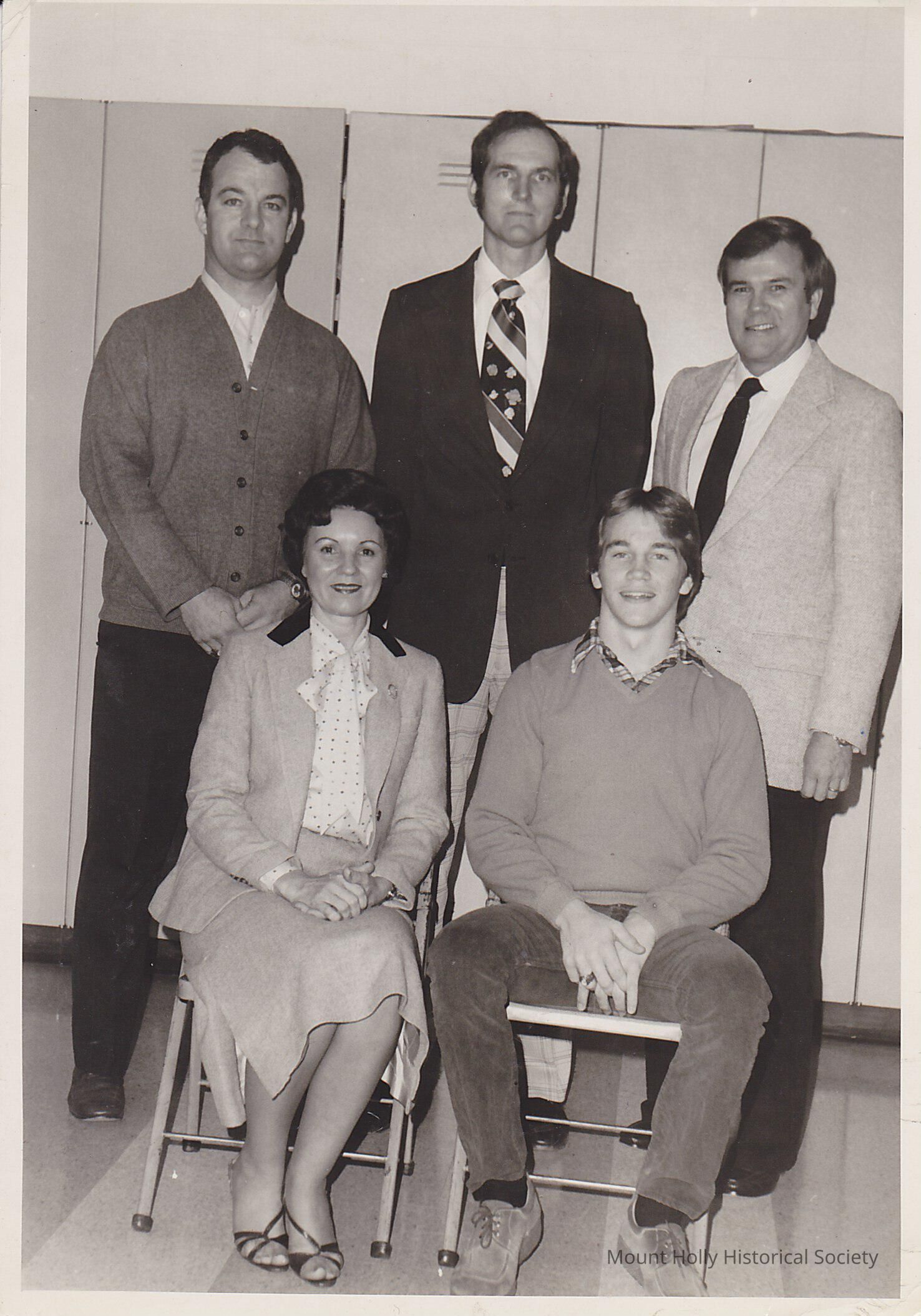 Seated left to right, Marcella Ellis, Unknown, Standing left to right, Terry Adams, Chet Spruill, Neb Hollis "helping aid"