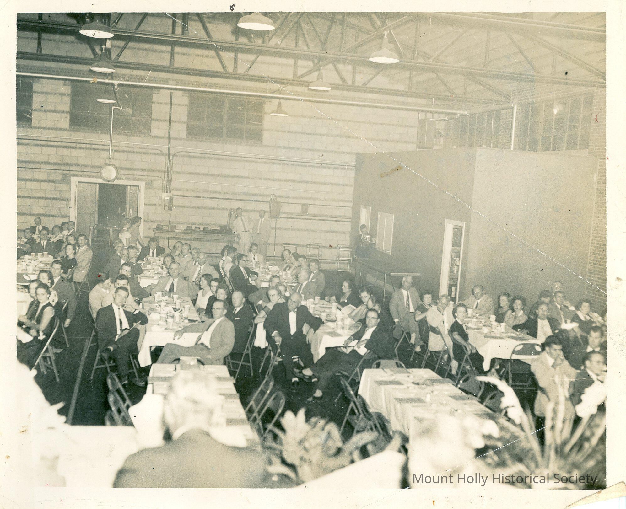 Gathering of people at banquet; view from behind speakers' dais Looks like inside of a mill