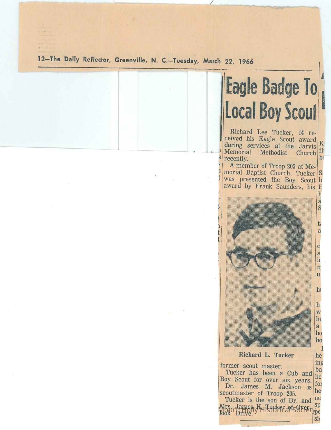 Article from "Daily Reflector" (Greenville, NC) about Richard Tucker, 14, receiving Eagle Scout award