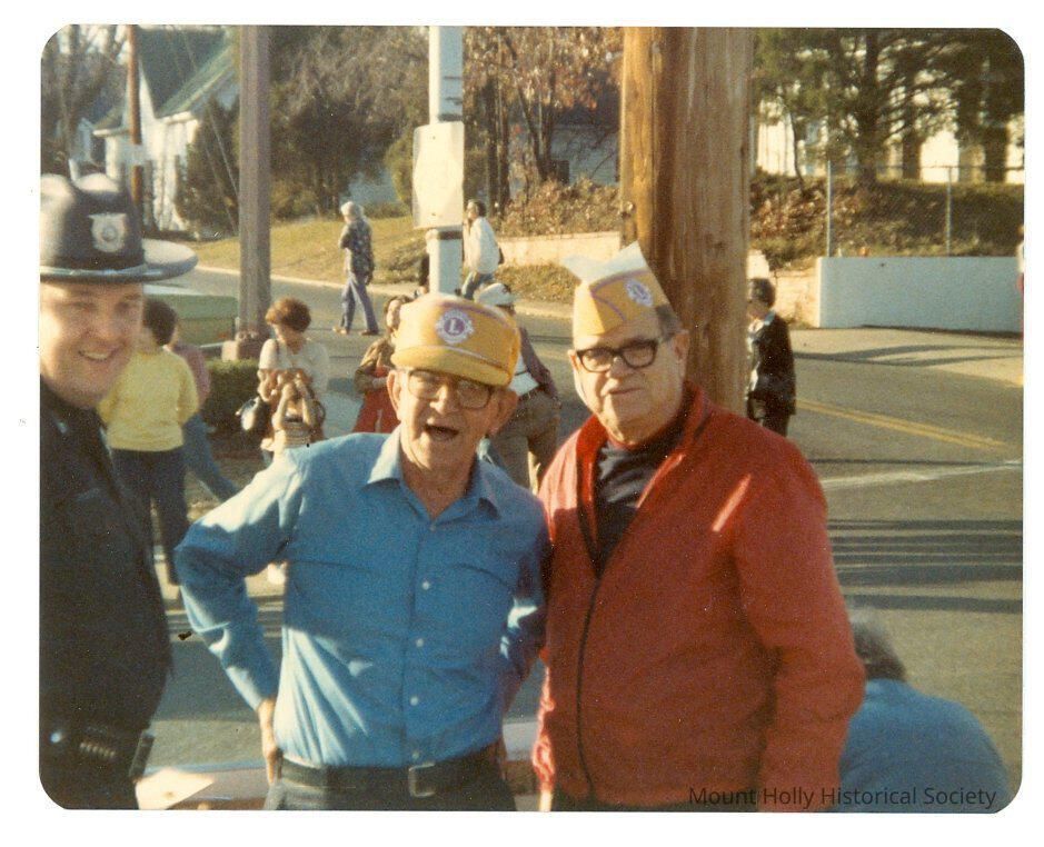 Two unidentified Lions Club members with a police officer, probably at a gathering