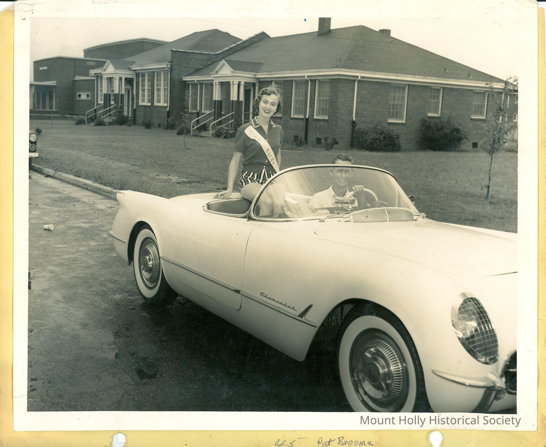 Unidentified young woman with sash in backseat of parked convertible, with young man at the wheel; on the photo's back is written "Pat Broome"