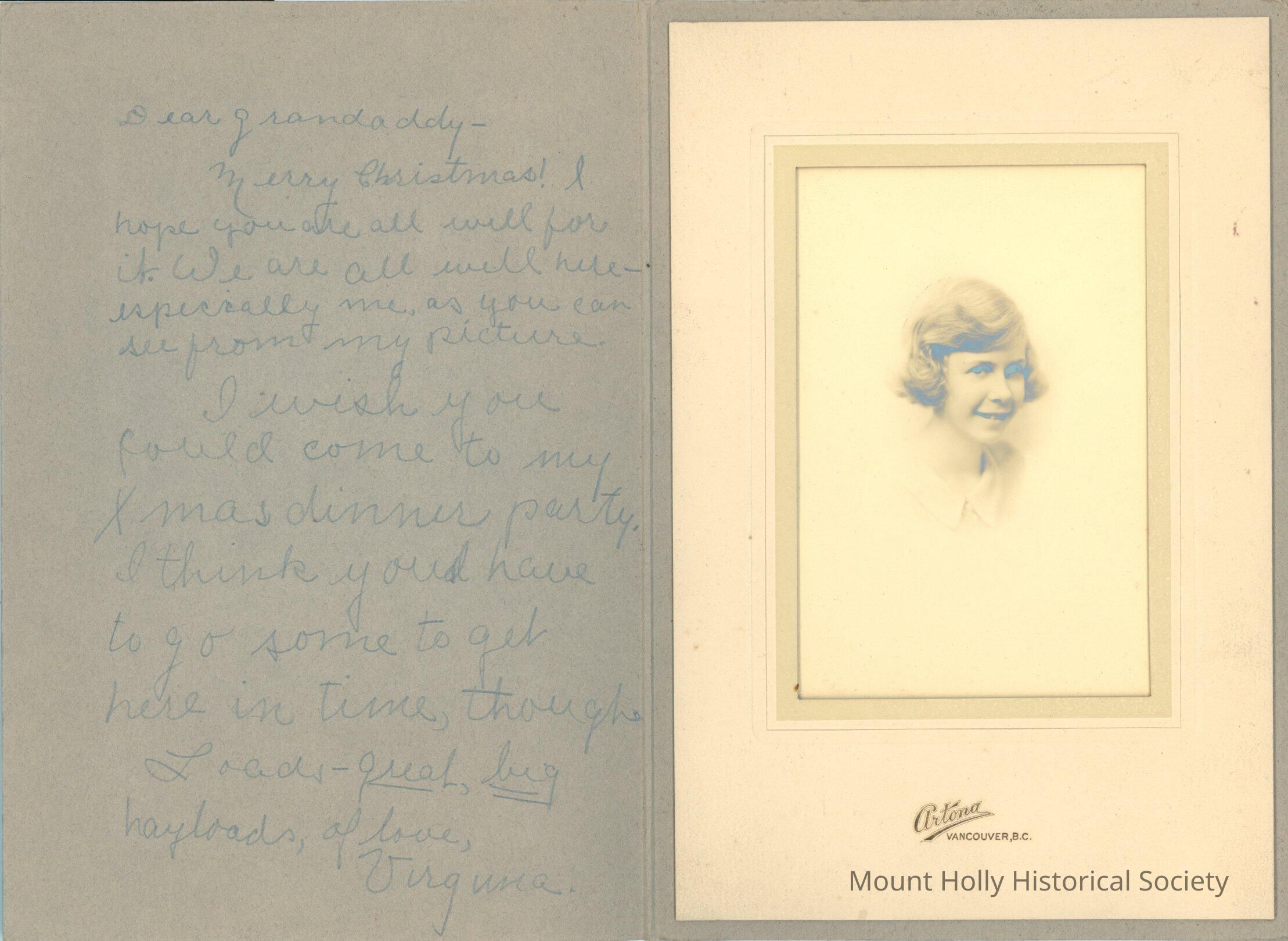 Undated Christmas card from Virginia to her grandfather, with photo of Virginia (otherwise unidentified)