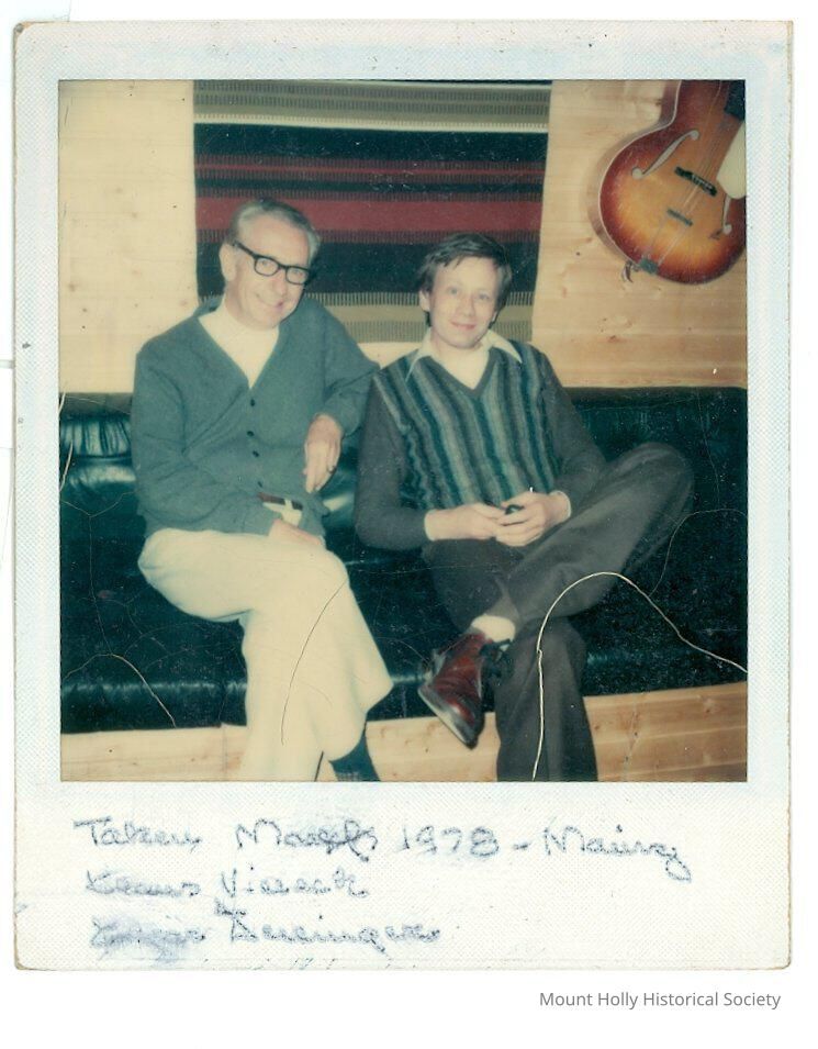 Two men on black leather couch with guitar hung up on wall above them and to the right