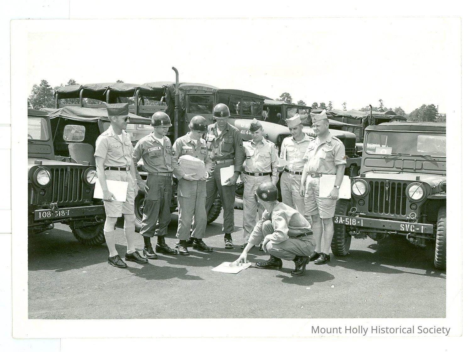 Eight military men, standing around while one kneeling points to a document on the ground, surrounded by military vehicles