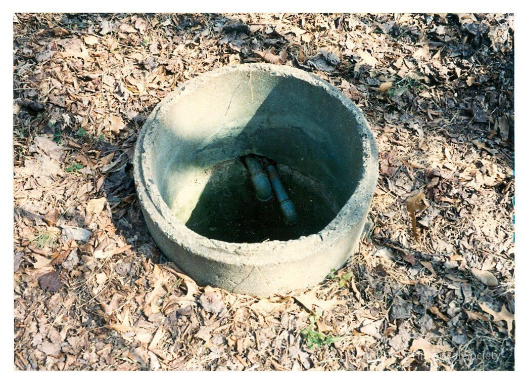 Concrete pipe, with two metal pipes entering it at an angle; the photo is looking down into the pipe