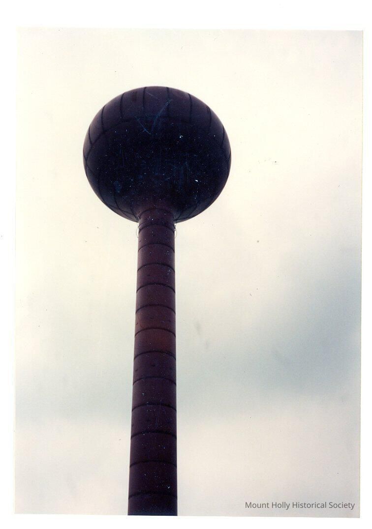 Photo of what may be a water tower, taken at dusk, at the ground and looking up