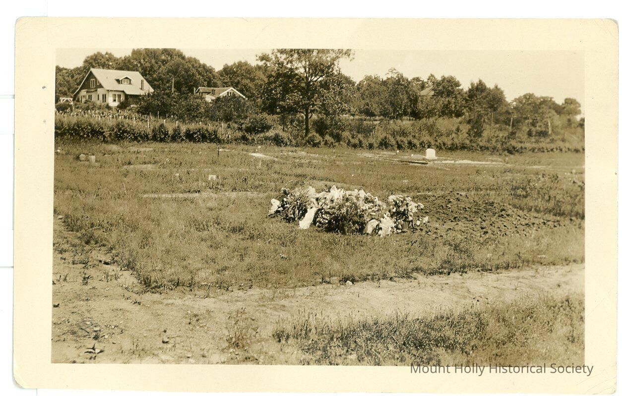 Newly established cemetery: In foreground an open grave with bouquets of flowers beside it, and houses in the background