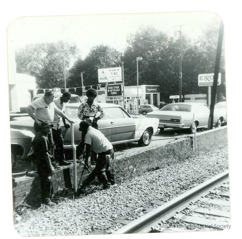 Five men (four black, one white) working on an upright PVC pipe near Exxon gas station; on the back is written "The End of an Era"
