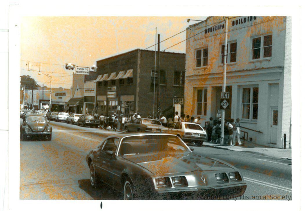 Main St., with balloons on wires and many people on the sidewalk in front of the Municipal Building