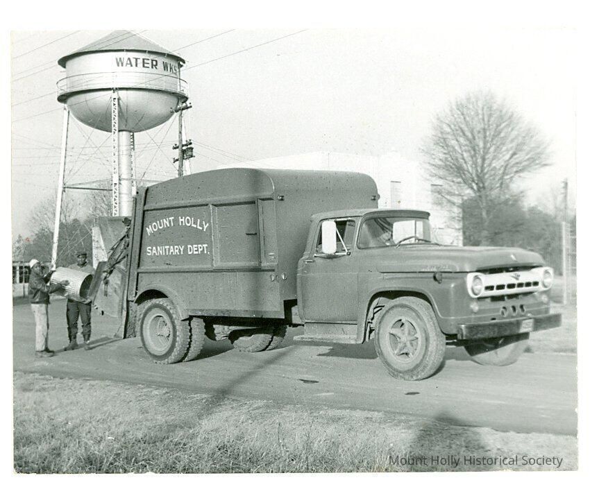 Garbage truck: Two black men empty a garbage can into it while a white man drives