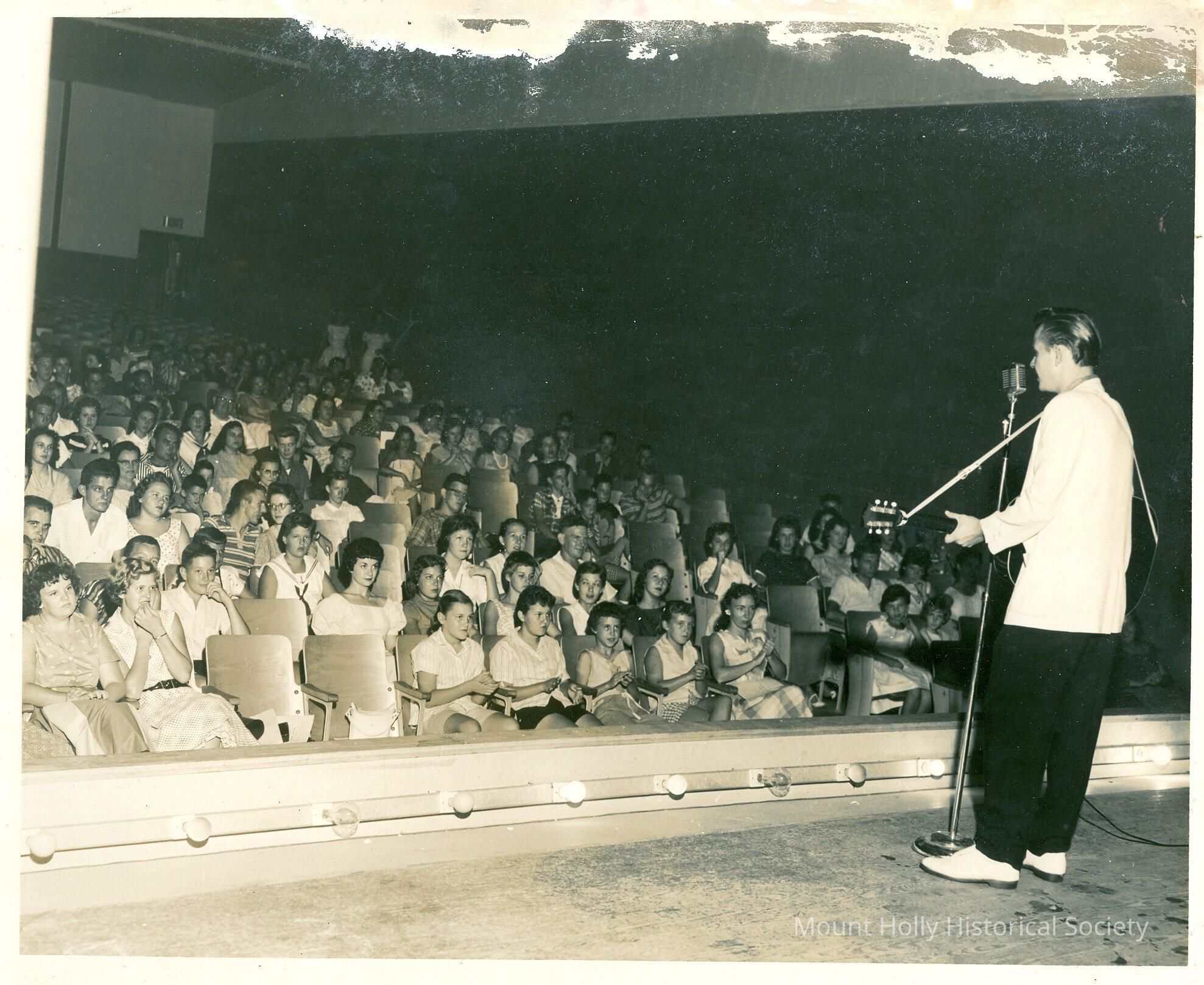 Man with guitar (back to viewer) performing for an audience in an auditorium