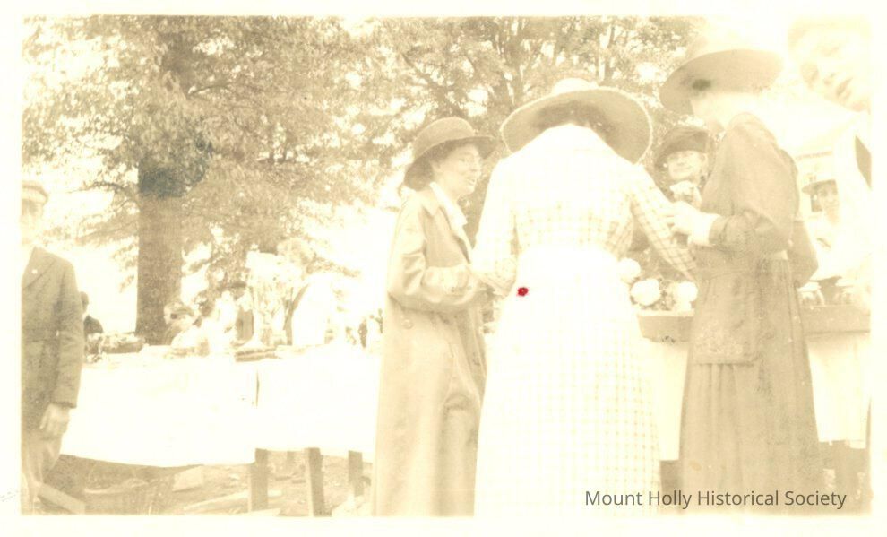 Several people at a cookout or potluck outdoors: Four women are talking in the foreground while another looks at the camera, same as 2012.14.14