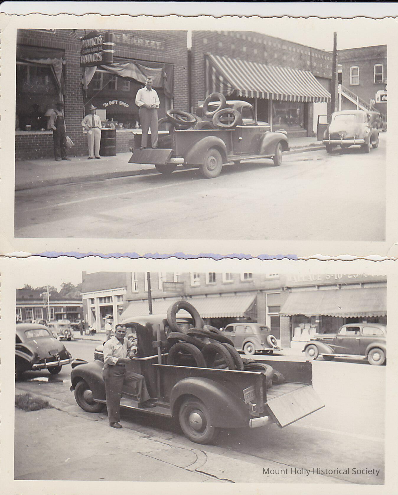 Joyce Clark standing in front of the Gift Shop, Piano Store, with hat on JoAnn Duke's stepfather N Main St