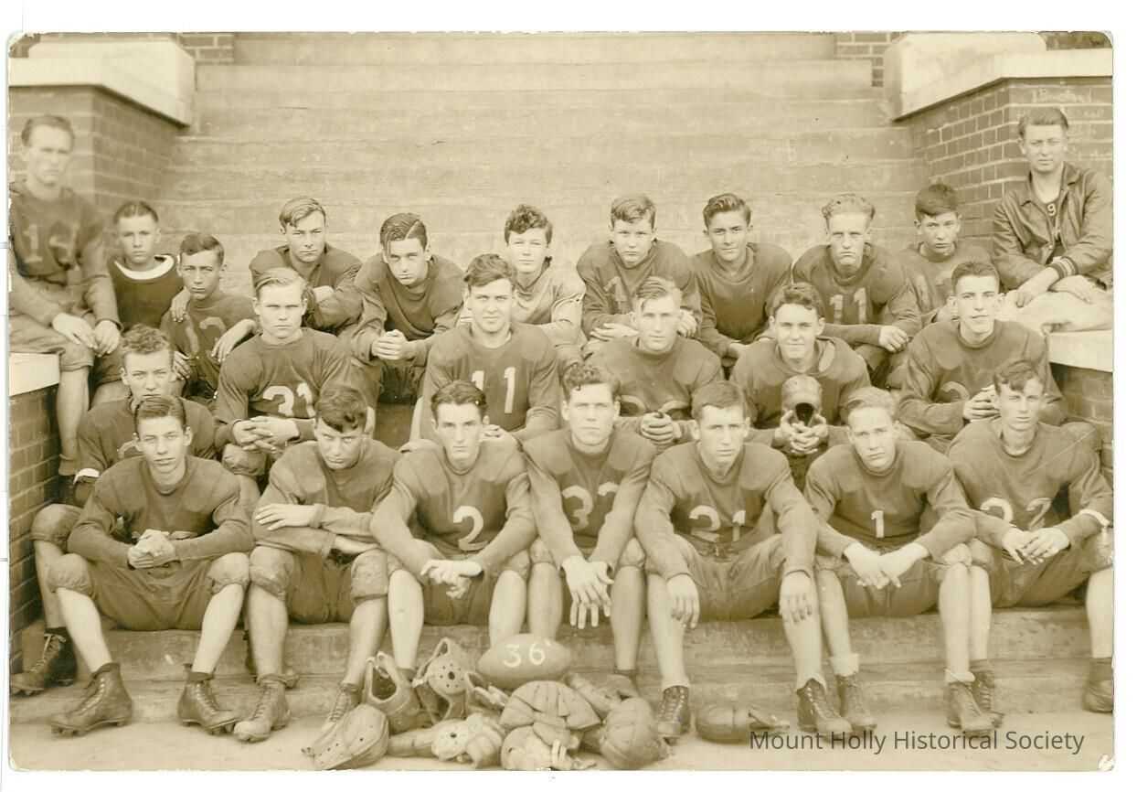 Football team posed on steps of building; from back of photo "Nell Johnston"