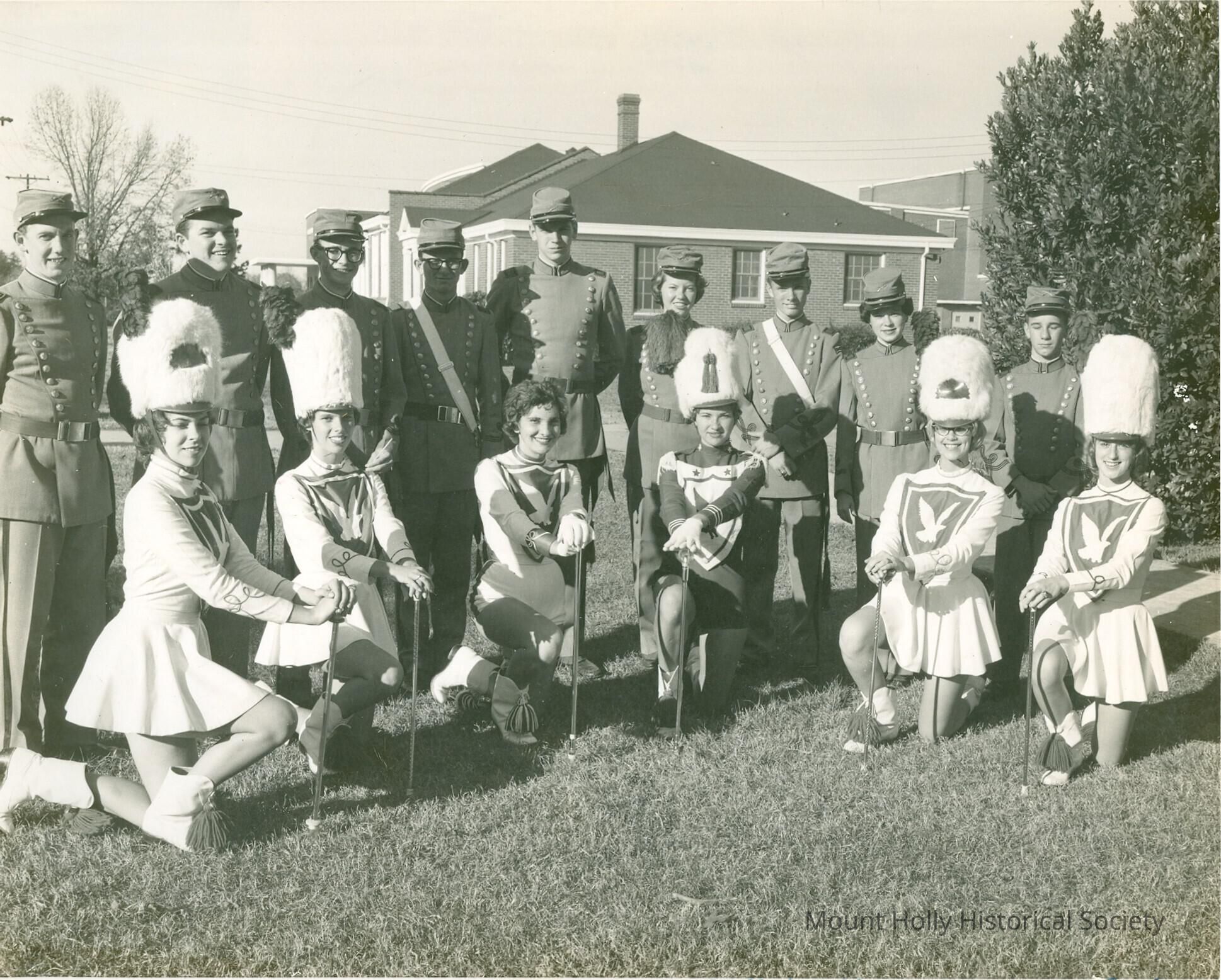Front row: 6 majorettes kneeling; back row: 9 people (2 women, 7 men) in Confederate band uniforms