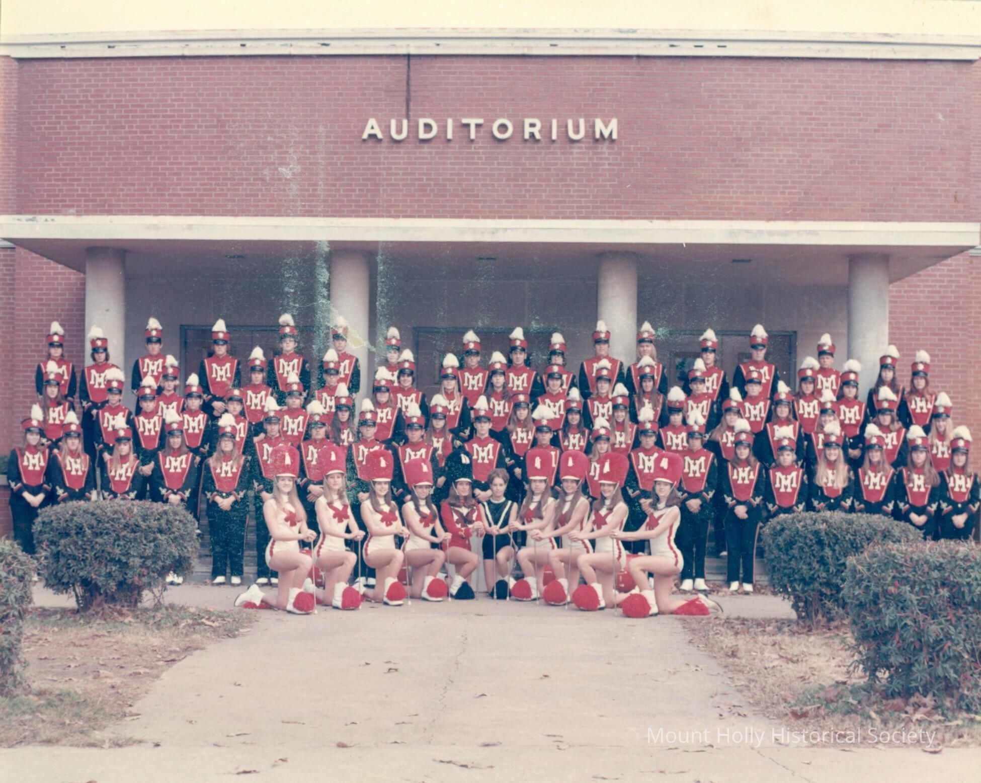 Mt. Holly High School marching band and majorettes posed in front of auditorium (with different uniforms than in 2012.38.9)