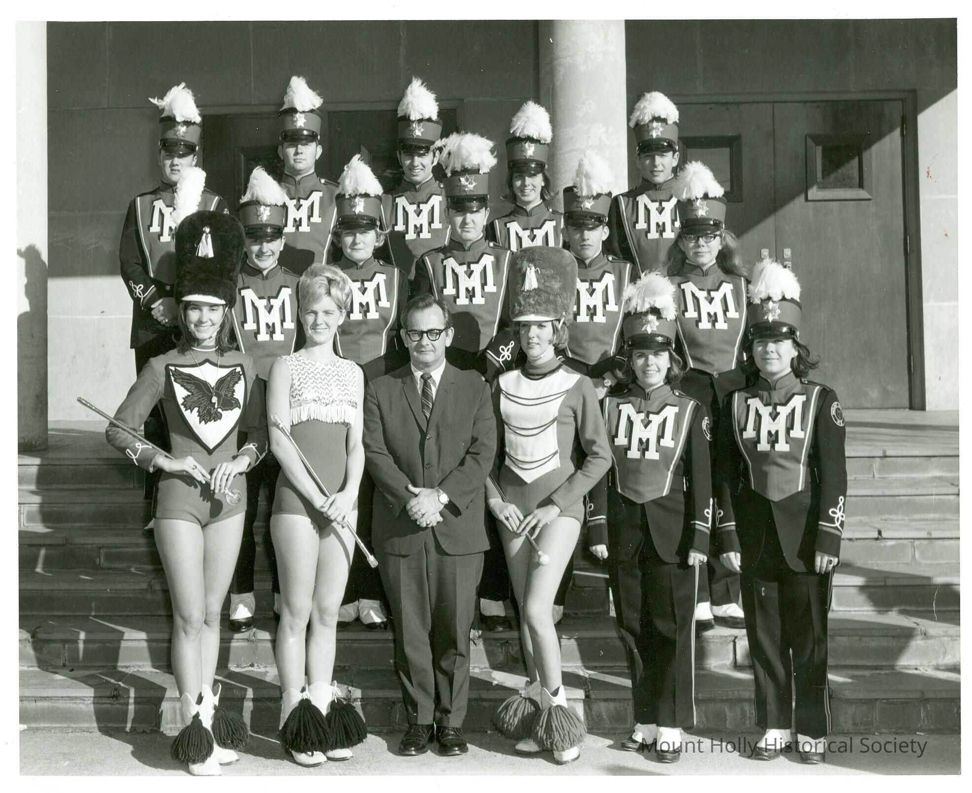 Mt. Holly Marching Band members (12) and majorettes (3) with band director, posed for photo