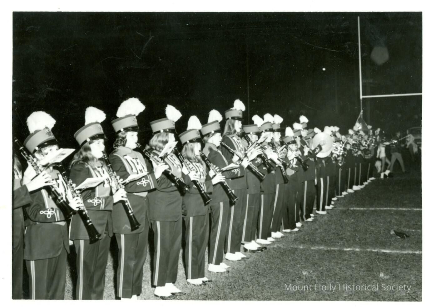 Mt. Holly Marching Band arrayed in a line, performing at a game at night
