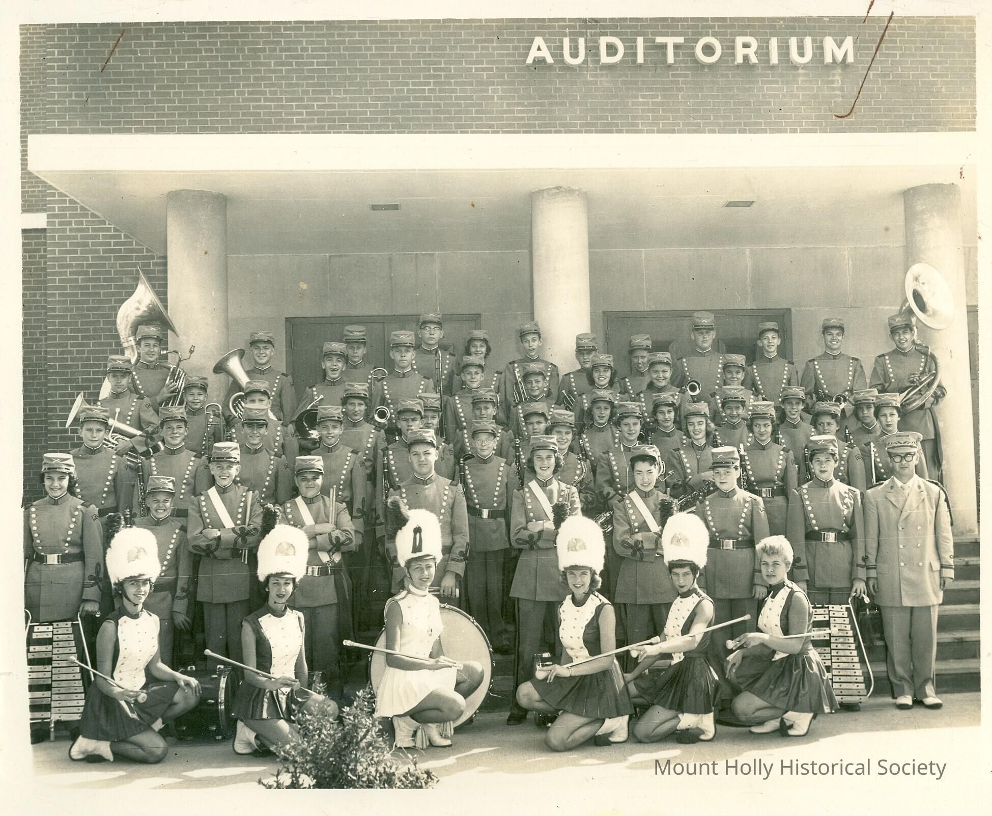 Mt. Holly Marching Band in Confederate uniforms, with majorettes kneeling in front, posed on steps of auditorium