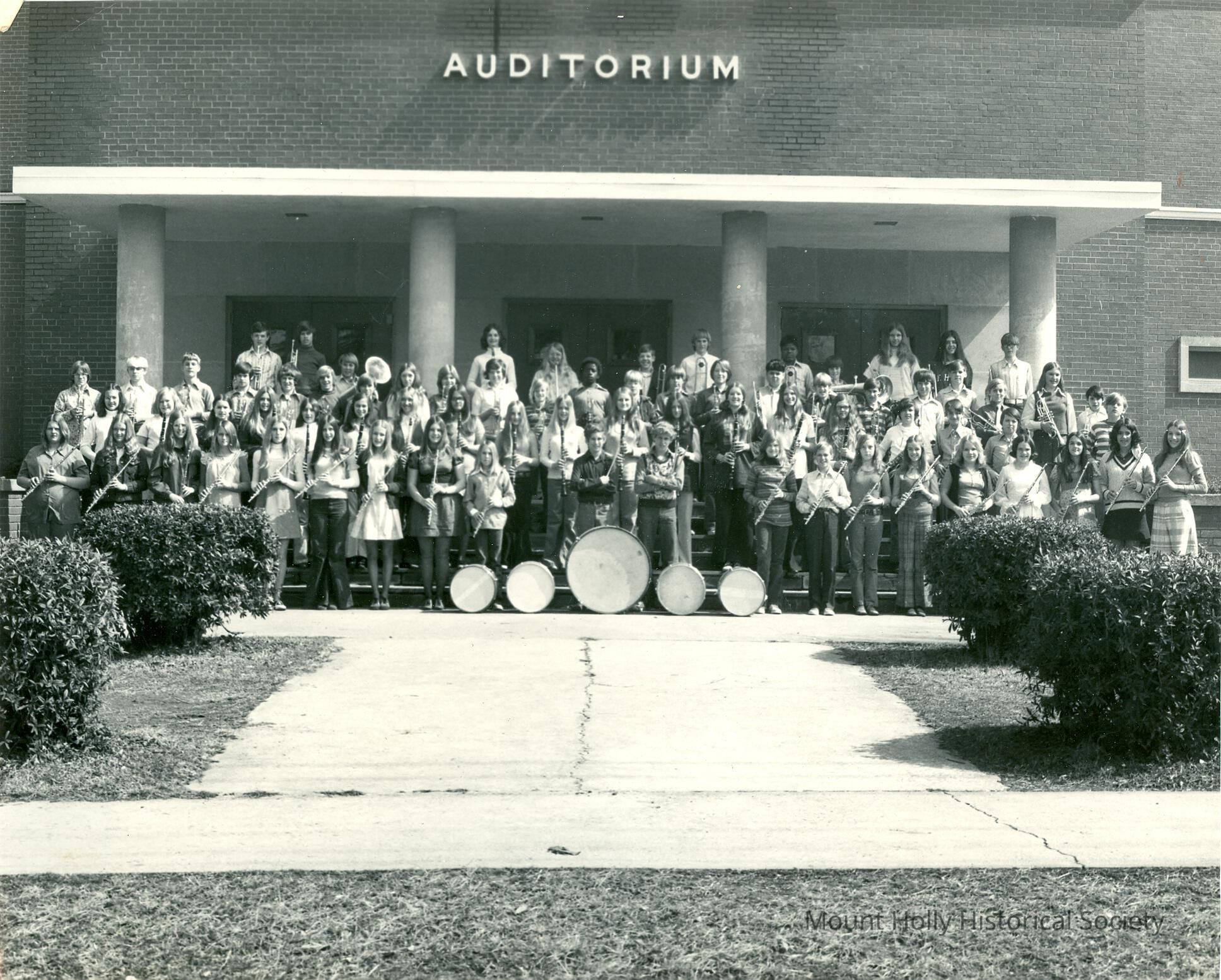 Mt. Holly band posed on steps of auditorium without uniforms or majorettes