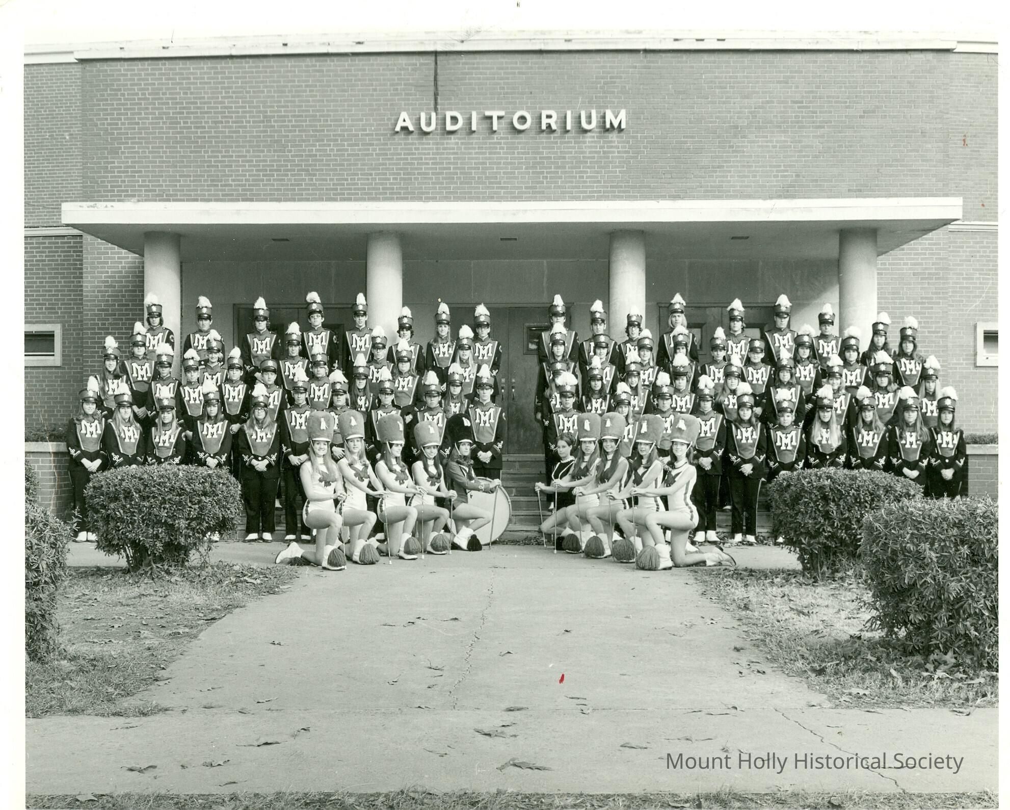 Last concert of Mt. Holly High School band: Band members arrayed in two blocks before auditorium with majorettes kneeling in front in two separate rows
