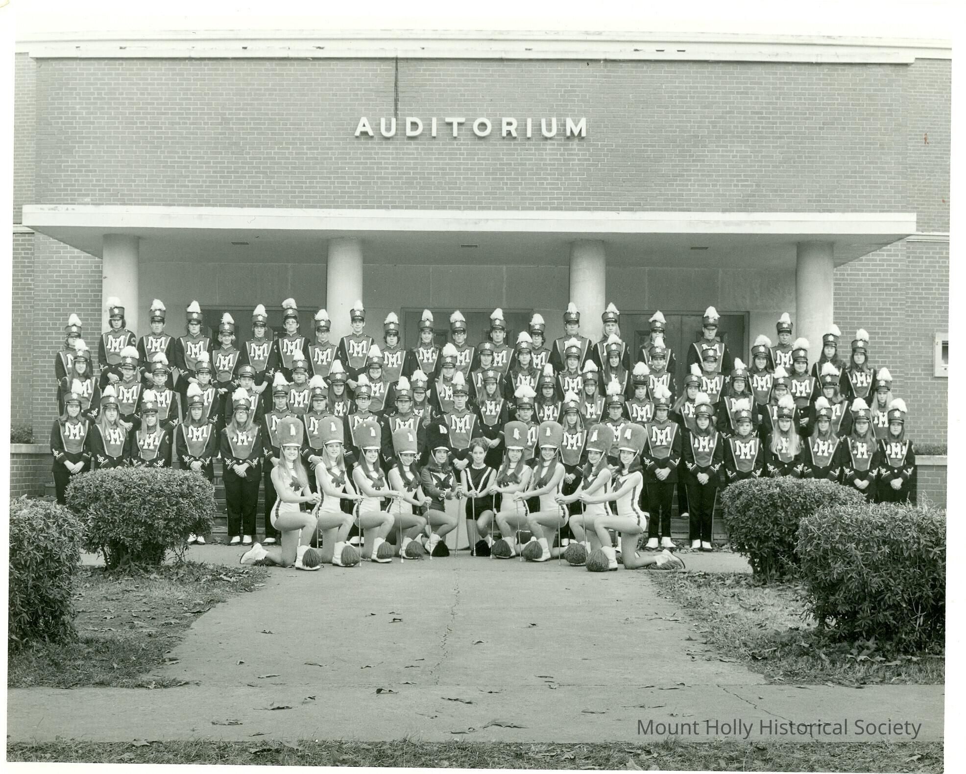 Last concert of Mt. Holly High School band: Band members posed in a single block before auditorium, with majorettes kneeling in front in a single row
