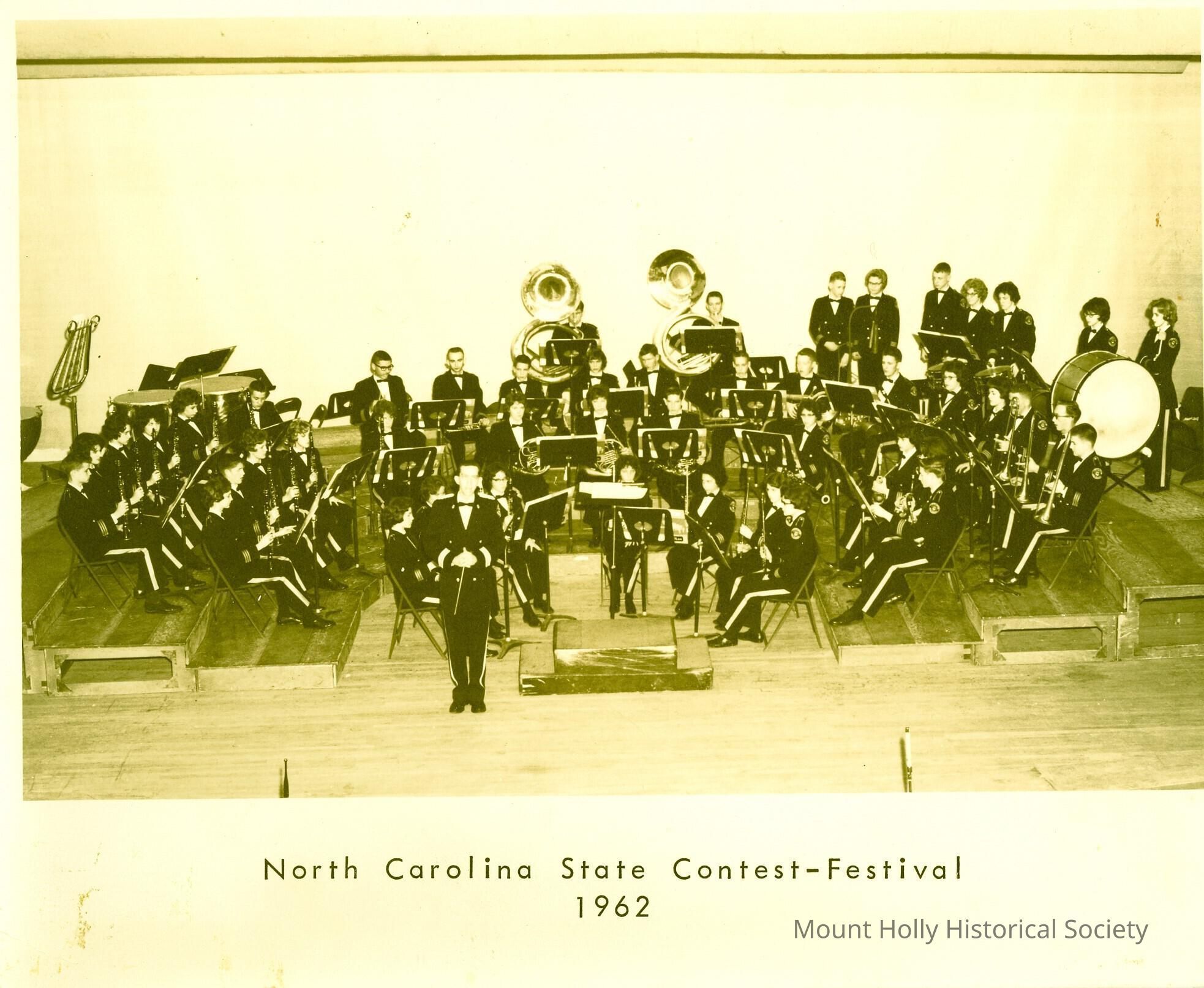 Band members in tuxedos seated on chairs on wooden risers, at NC State Contest-Festival
